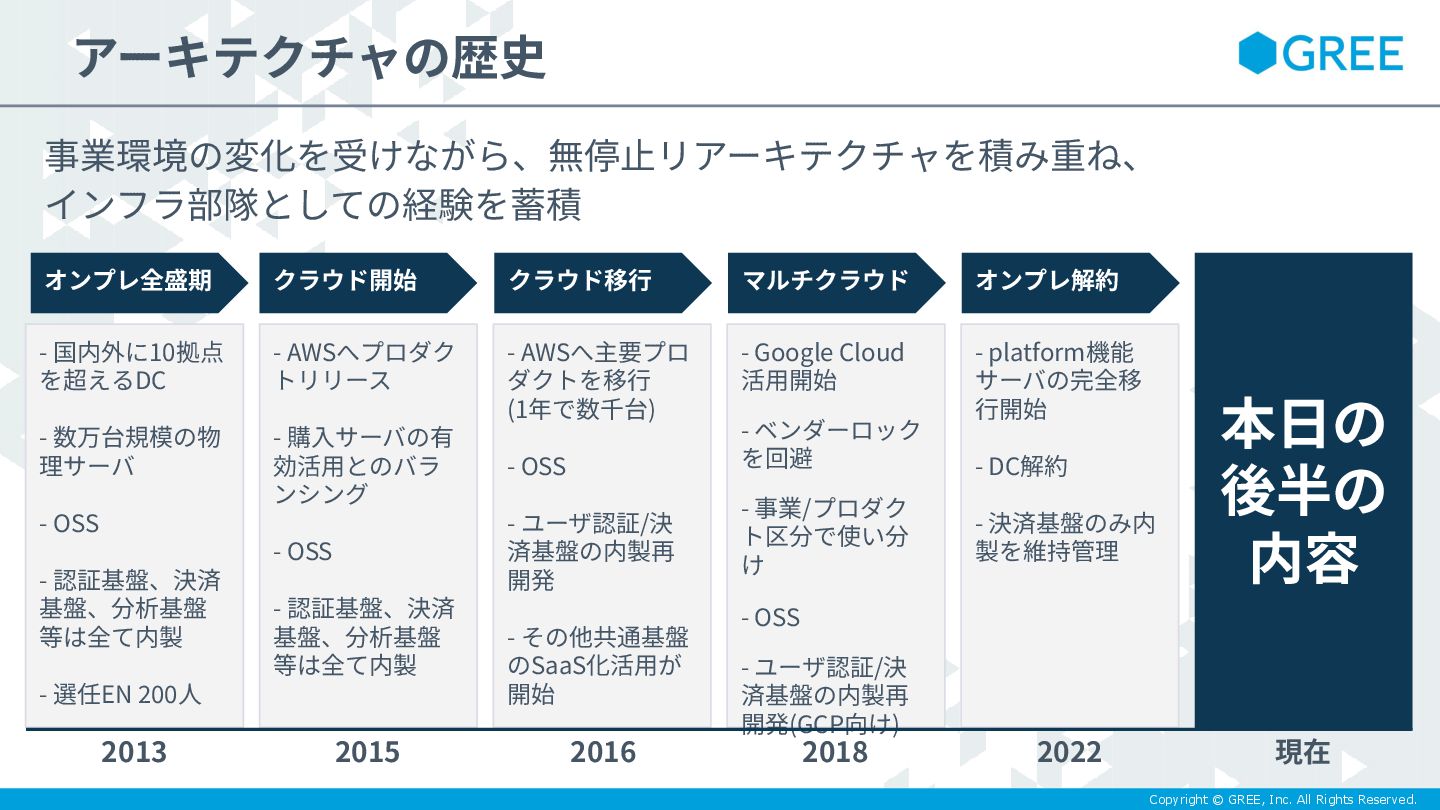 Copyright © GREE, Inc. All Rights Reserved. アーキテクチャの歴史 事業環境の変化を受けながら、無停⽌リアーキテクチャを積み重ね、 インフラ部隊としての経験を蓄積