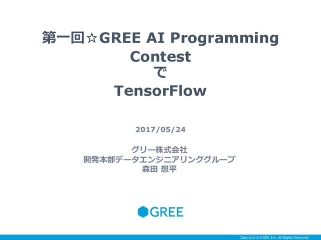 Contest で TensorFlow 2017/05/24 グリー株式会社 開発本部データエンジニアリンググループ 森⽥ 想平