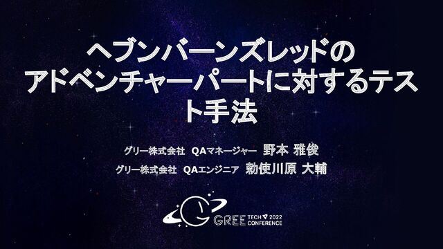 グリー株式会社 QAエンジニア 勅使川原 大輔 ヘブンバーンズレッドの アドベンチャーパートに対するテス ト手法 グリー株式会社 QAマネージャー 野本 雅俊