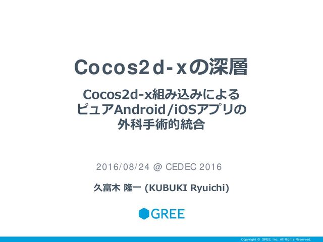 Cocos2d-xのビューを、全画面ではなく画面の1部に表示 • 矩形ではなく、丸みのある角など自由な形状に • フレームバッファーをアルファ値を持てるフォーマット にする • iOS • CCEAGLViewでeaglLayer.opaque = NO、 pixelFormatをkEAGLColorFormatRGBA8に • AndroidはそのままでOK • Cocos2d-x側でそもそも黒く塗りつぶしていたので透明 に替える • FrameBufferで_clearColor(Color4F(0, 0, 0, 0))、 Rendererで_clearColor.a = 0.0f Cocos2d-xシーンのモーダルダイアログ表示