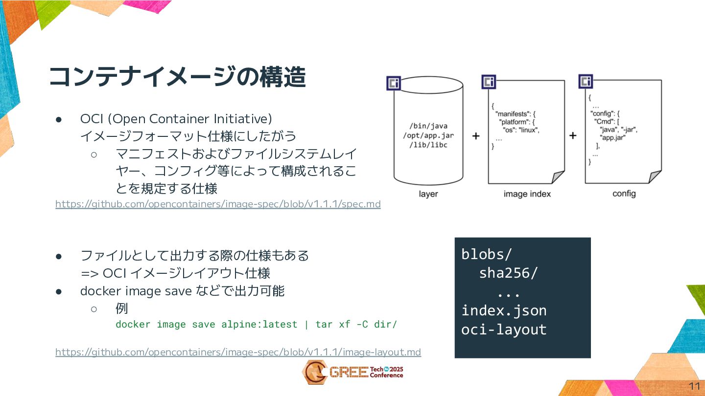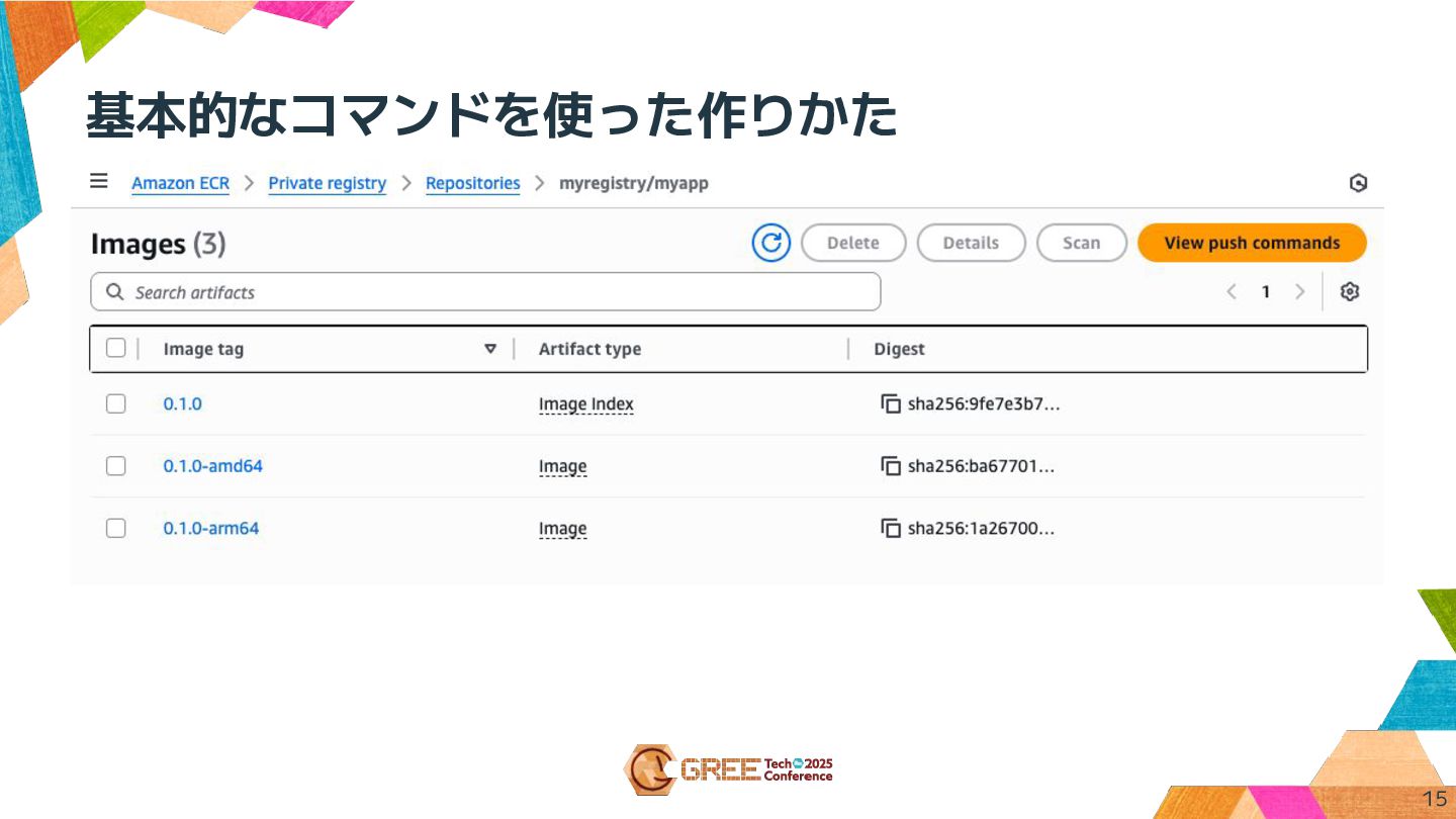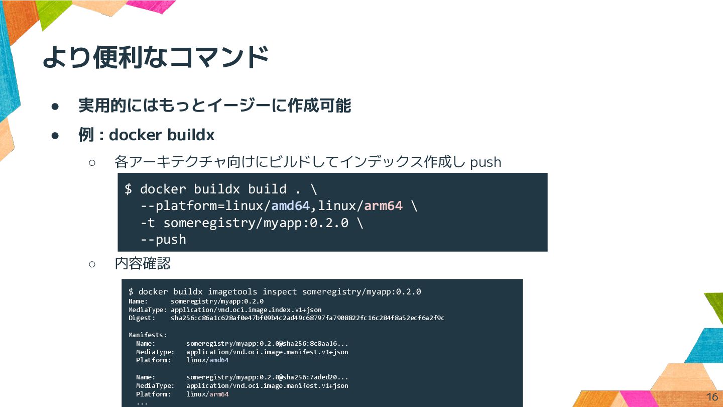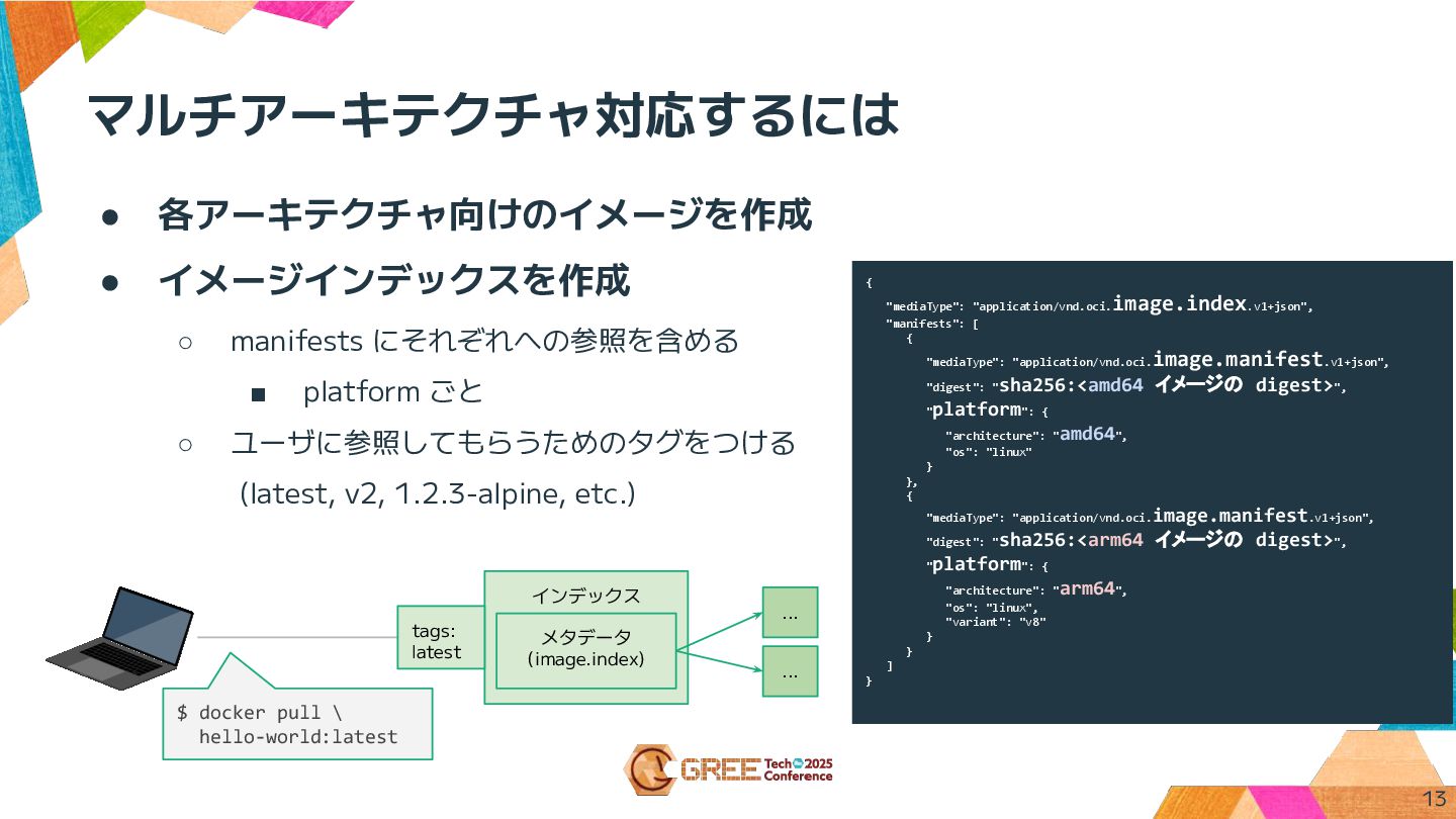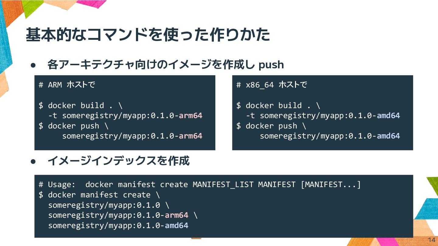 ごと ◦ ユーザに参照してもらうためのタグをつける (latest, v2, 1.2.3-alpine, etc.) 13 { "mediaType": "application/vnd.oci. image.index.v1+json", "manifests": [ { "mediaType": "application/vnd.oci. image.manifest.v1+json", "digest": "sha256:<amd64 イメージの digest>", "platform": { "architecture": "amd64", "os": "linux" } }, { "mediaType": "application/vnd.oci.image.manifest.v1+json", "digest": "sha256:<arm64 イメージの digest>", "platform": { "architecture": "arm64", "os": "linux", "variant": "v8" } } ] } インデックス メタデータ (image.index) ... ... $ docker pull \ hello-world:latest tags: latest