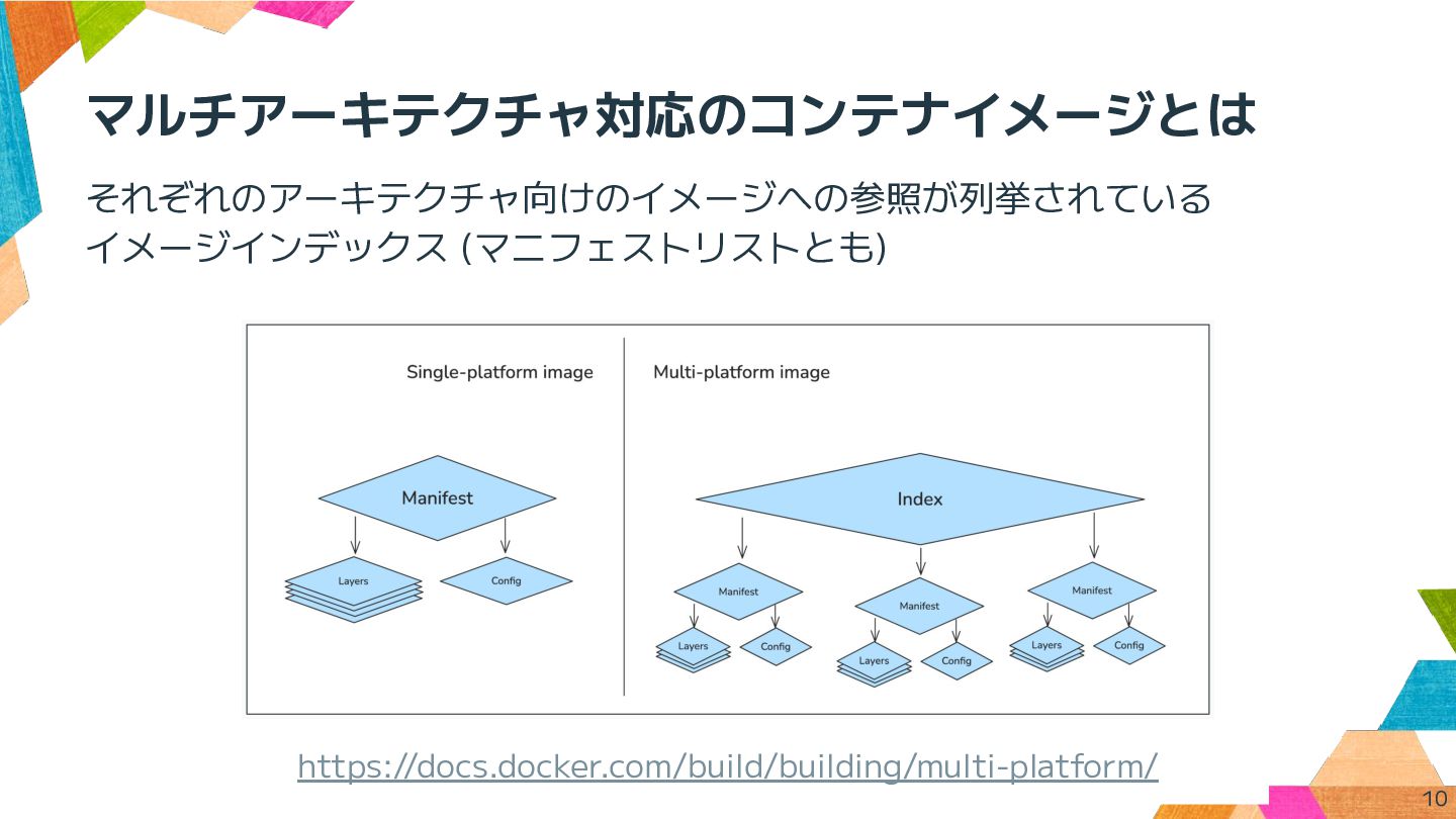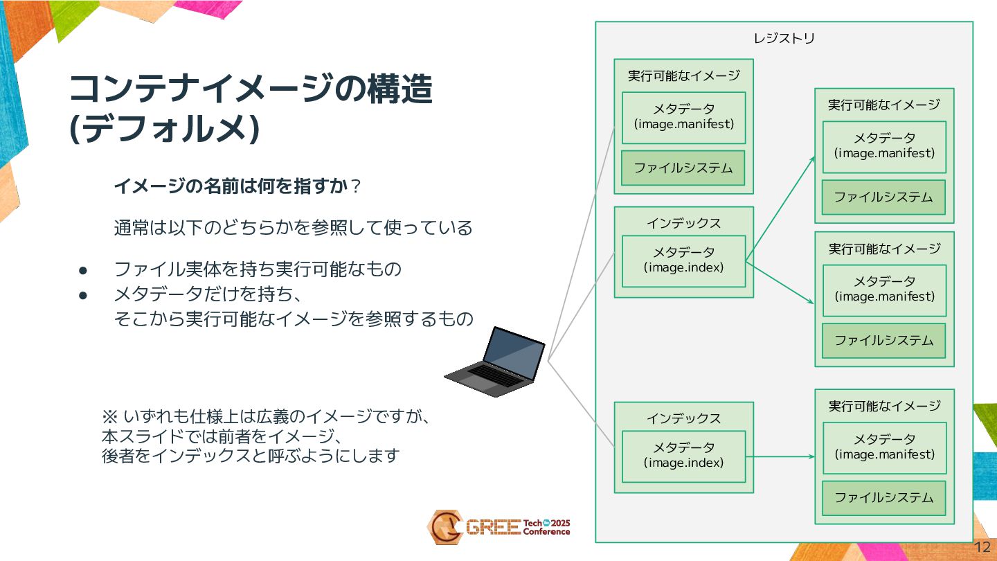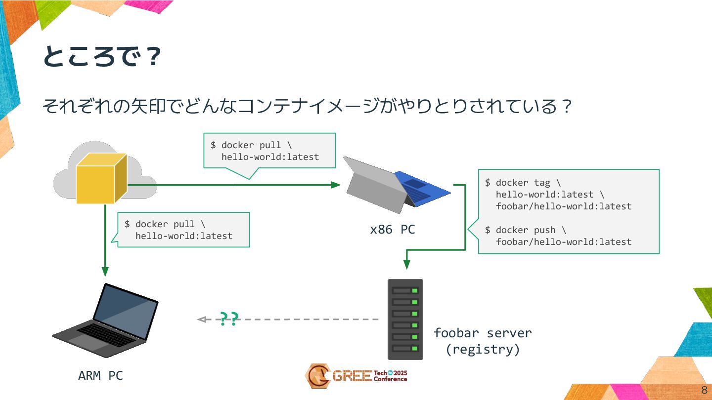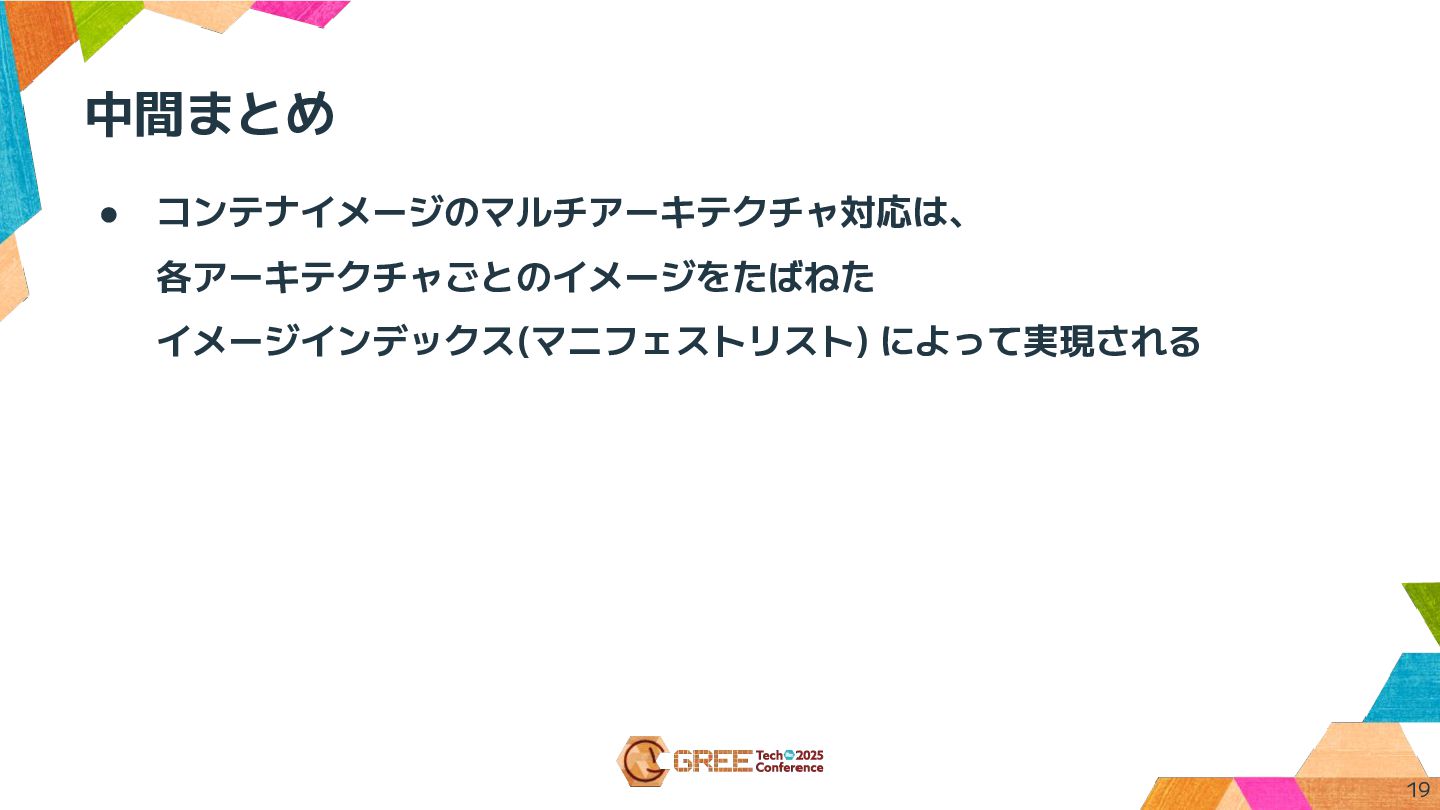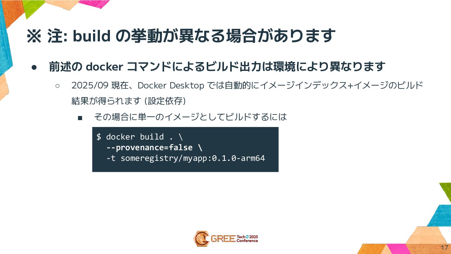 ごと ◦ ユーザに参照してもらうためのタグをつける (latest, v2, 1.2.3-alpine, etc.) 13 { "mediaType": "application/vnd.oci. image.index.v1+json", "manifests": [ { "mediaType": "application/vnd.oci. image.manifest.v1+json", "digest": "sha256:<amd64 イメージの digest>", "platform": { "architecture": "amd64", "os": "linux" } }, { "mediaType": "application/vnd.oci.image.manifest.v1+json", "digest": "sha256:<arm64 イメージの digest>", "platform": { "architecture": "arm64", "os": "linux", "variant": "v8" } } ] } インデックス メタデータ (image.index) ... ... $ docker pull \ hello-world:latest tags: latest