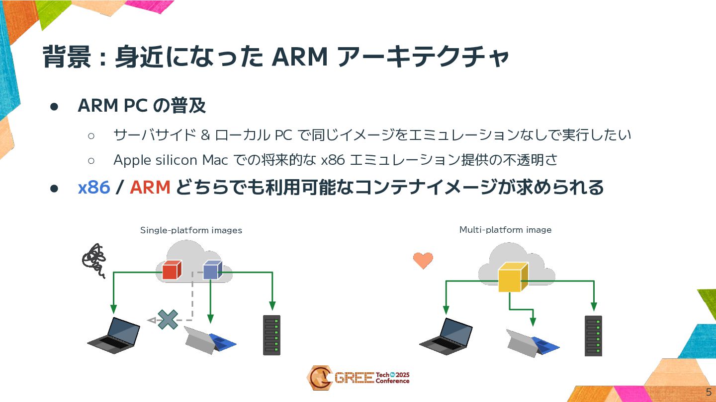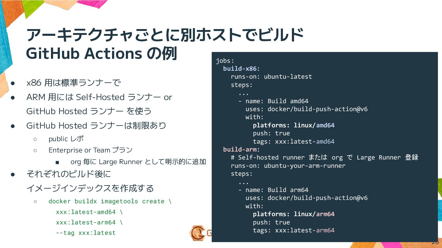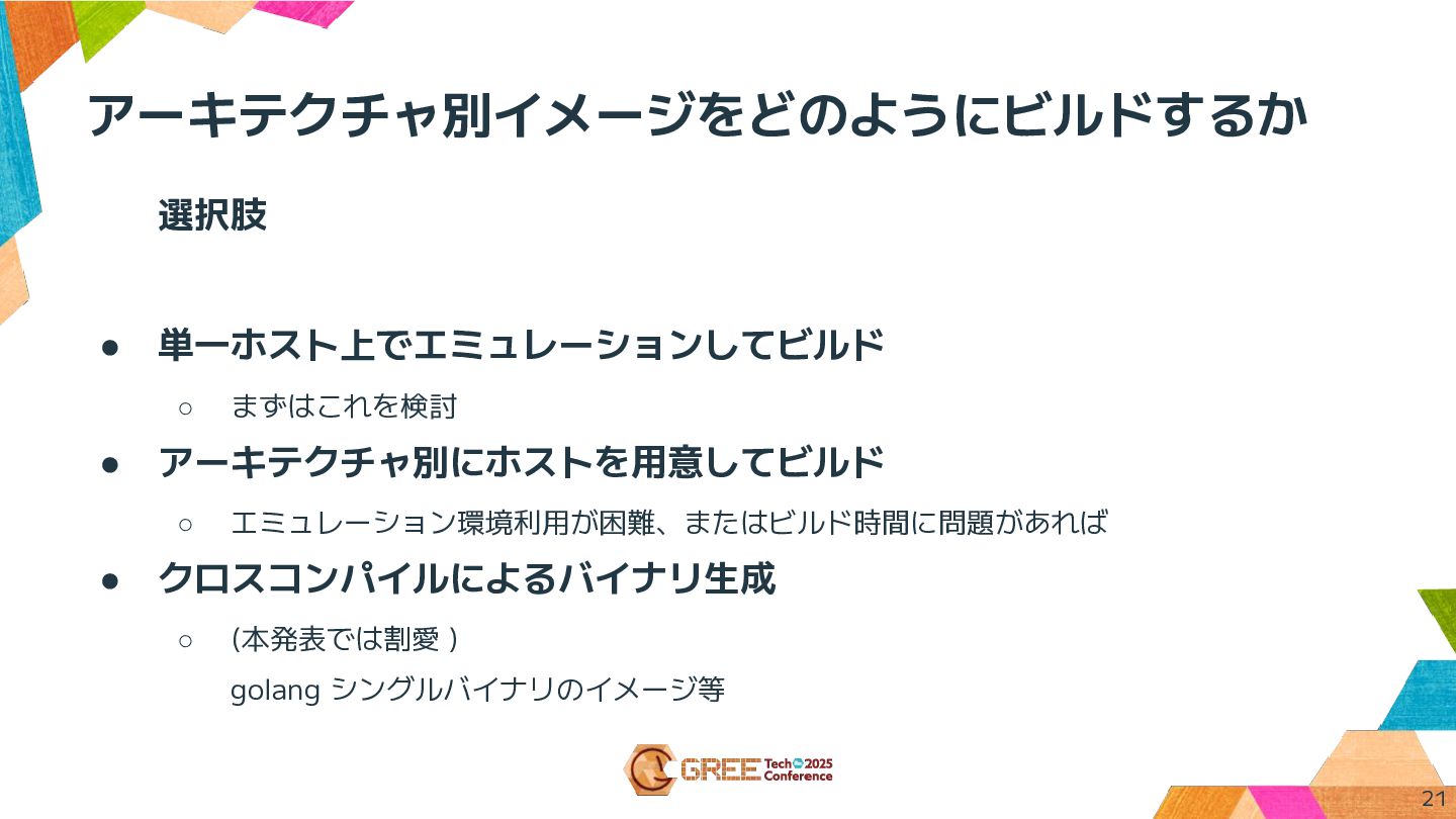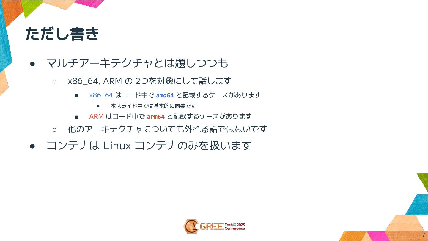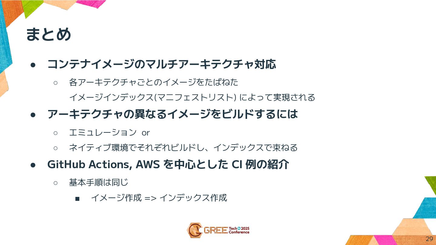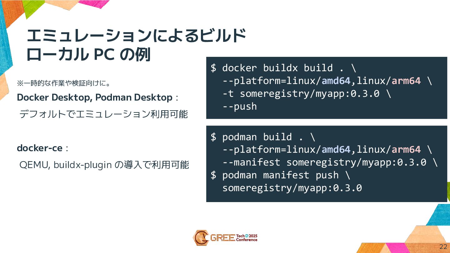 ごと ◦ ユーザに参照してもらうためのタグをつける (latest, v2, 1.2.3-alpine, etc.) 13 { "mediaType": "application/vnd.oci. image.index.v1+json", "manifests": [ { "mediaType": "application/vnd.oci. image.manifest.v1+json", "digest": "sha256:<amd64 イメージの digest>", "platform": { "architecture": "amd64", "os": "linux" } }, { "mediaType": "application/vnd.oci.image.manifest.v1+json", "digest": "sha256:<arm64 イメージの digest>", "platform": { "architecture": "arm64", "os": "linux", "variant": "v8" } } ] } インデックス メタデータ (image.index) ... ... $ docker pull \ hello-world:latest tags: latest