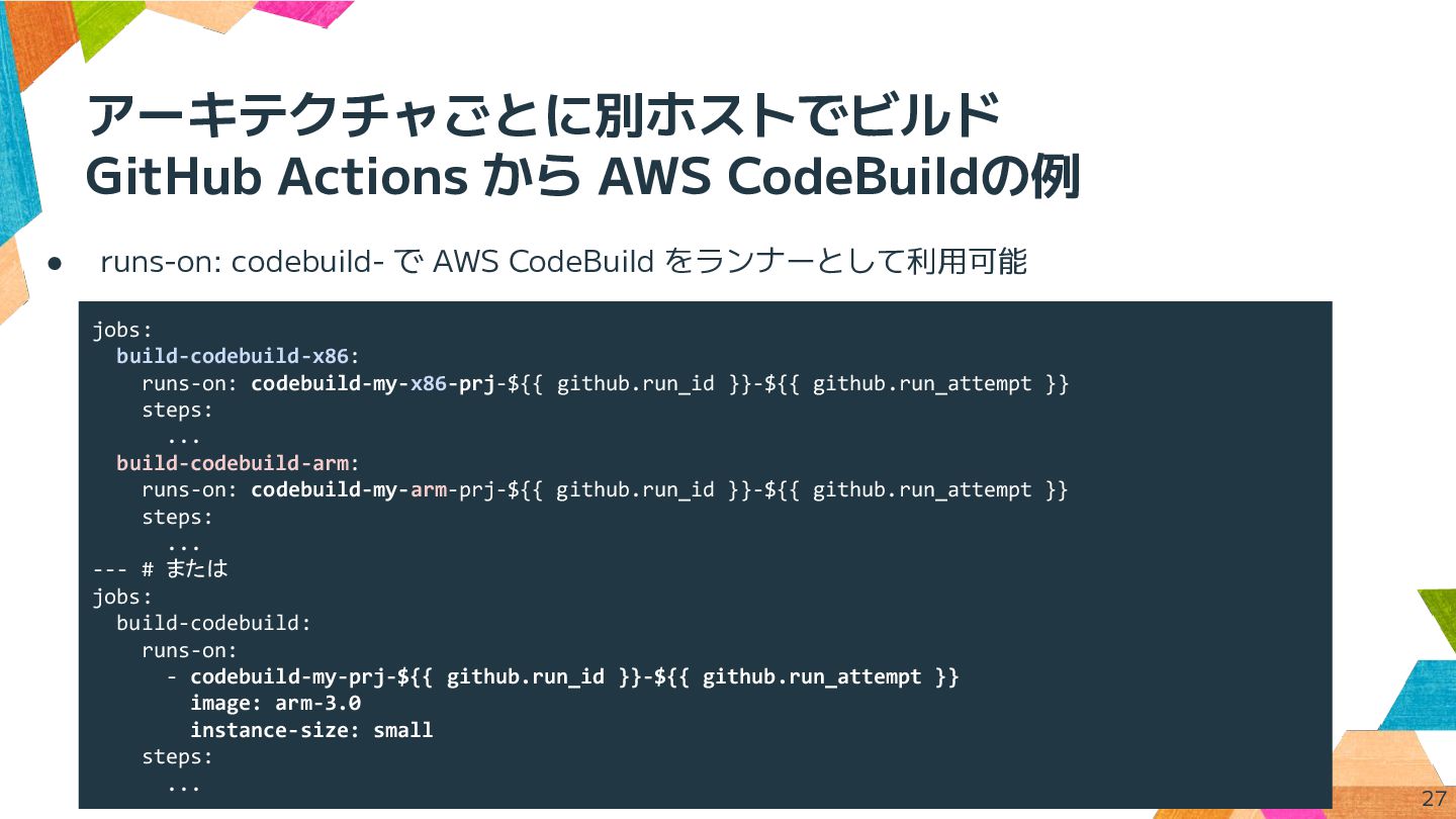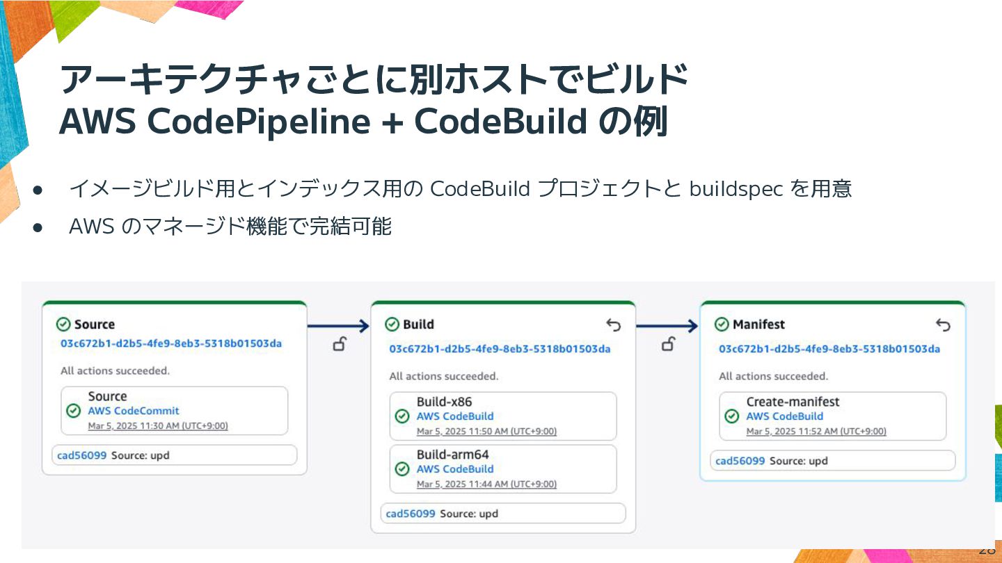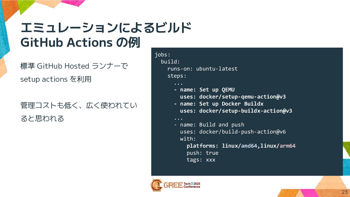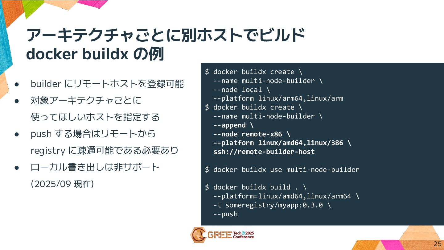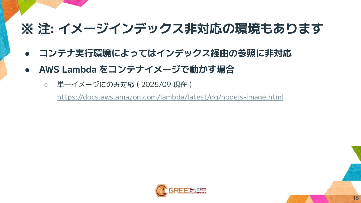 ごと ◦ ユーザに参照してもらうためのタグをつける (latest, v2, 1.2.3-alpine, etc.) 13 { "mediaType": "application/vnd.oci. image.index.v1+json", "manifests": [ { "mediaType": "application/vnd.oci. image.manifest.v1+json", "digest": "sha256:<amd64 イメージの digest>", "platform": { "architecture": "amd64", "os": "linux" } }, { "mediaType": "application/vnd.oci.image.manifest.v1+json", "digest": "sha256:<arm64 イメージの digest>", "platform": { "architecture": "arm64", "os": "linux", "variant": "v8" } } ] } インデックス メタデータ (image.index) ... ... $ docker pull \ hello-world:latest tags: latest