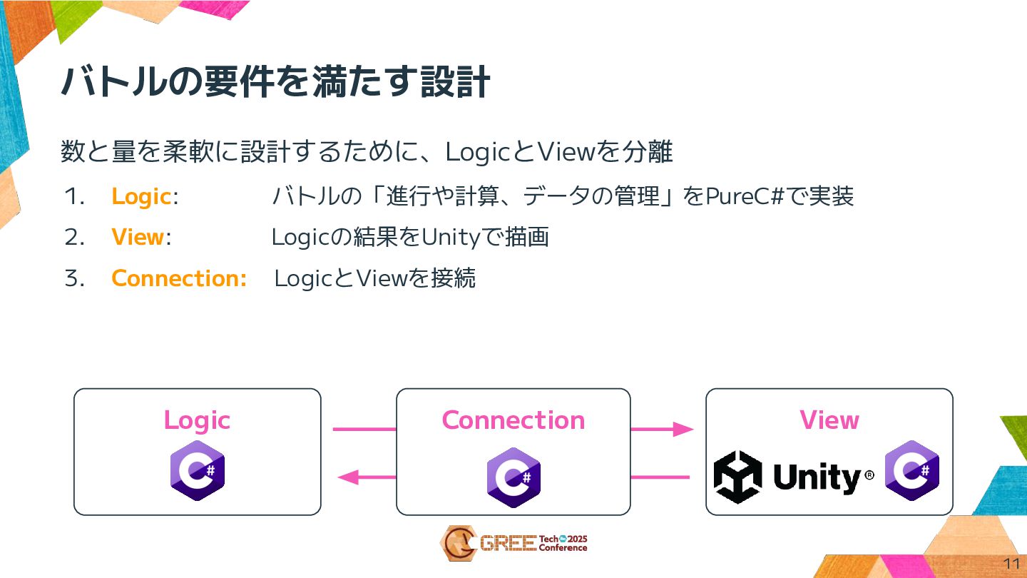 バトルの要件を満たす設計 数と量を柔軟に設計するために、LogicとViewを分離 1. Logic: バトルの「進行や計算、データの管理」をPureC#で実装 2. View: Logicの結果をUnityで描画 10 Logic
