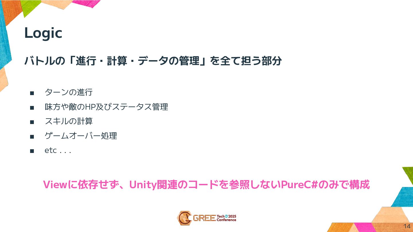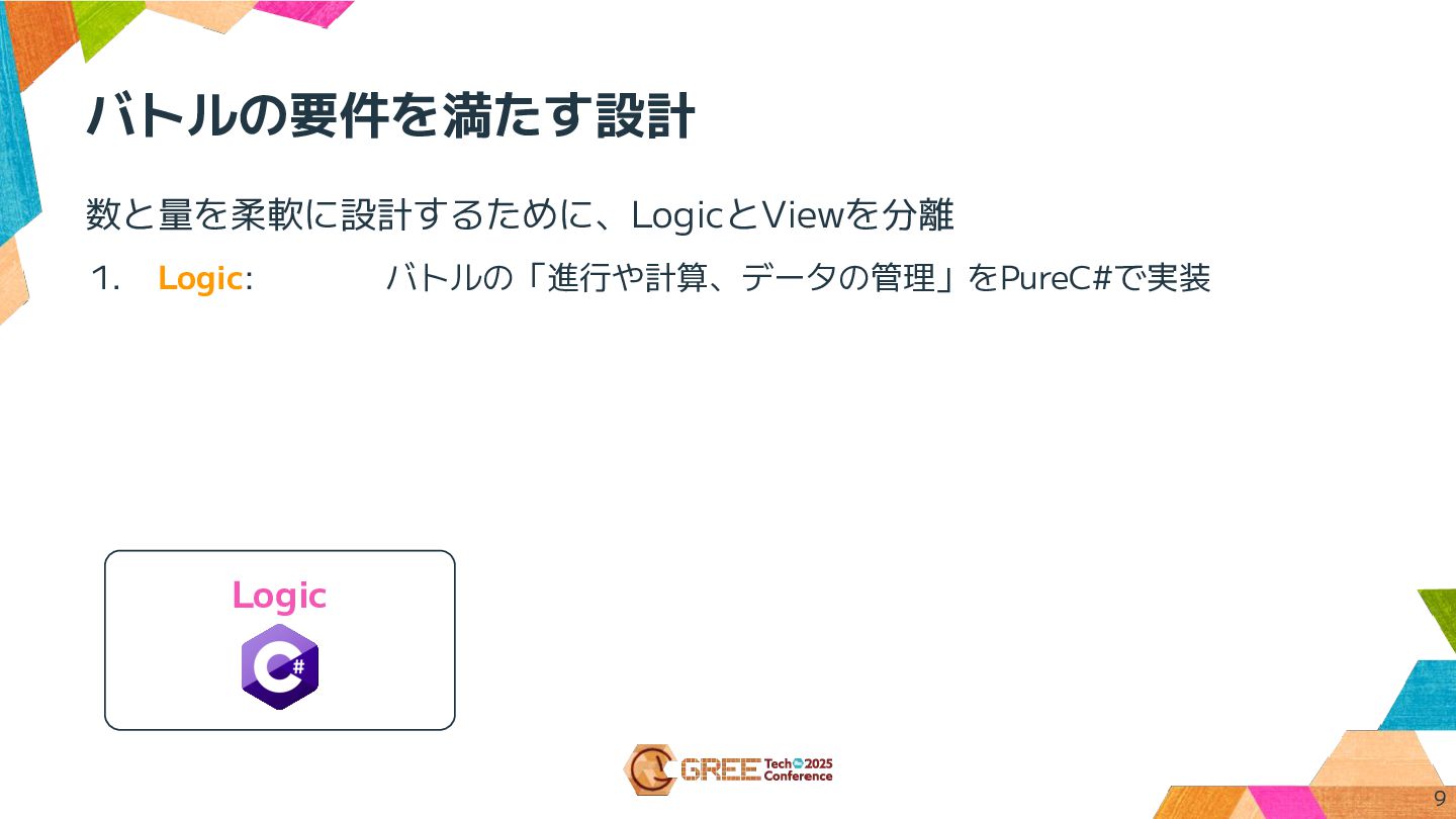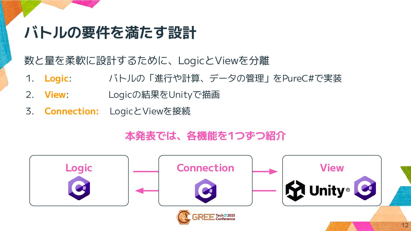 バトルの要件を満たす設計 数と量を柔軟に設計するために、LogicとViewを分離 1. Logic: バトルの「進行や計算、データの管理」をPureC#で実装 2. View: Logicの結果をUnityで描画 3. Connection: