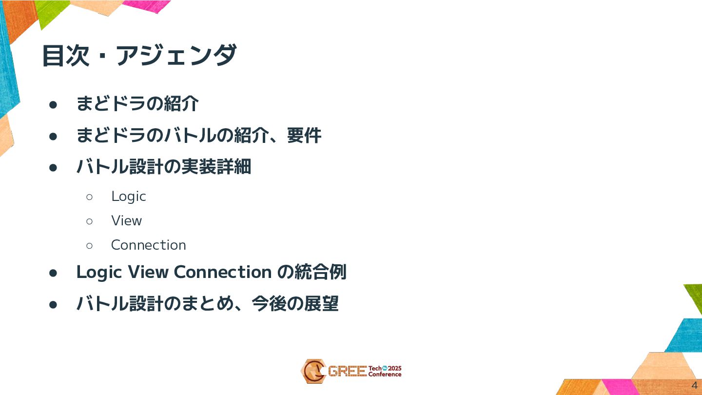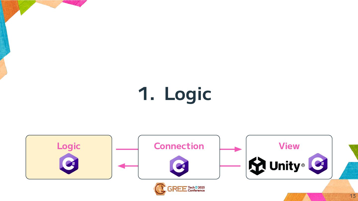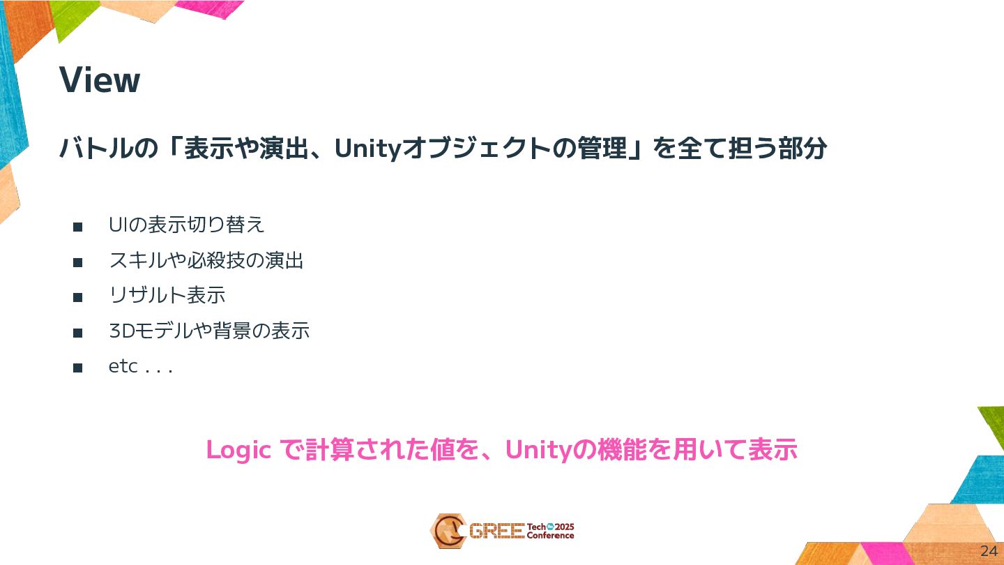 バトルの要件を満たす設計 数と量を柔軟に設計するために、LogicとViewを分離 1. Logic: バトルの「進行や計算、データの管理」をPureC#で実装 2. View: Logicの結果をUnityで描画 3. Connection: