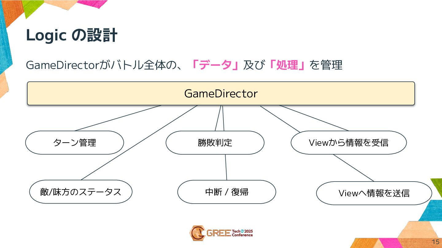 GameDirectorがバトル全体の、「データ」及び「処理」を管理 Logic の設計 15 GameDirector 敵/味方のステータス ターン管理 Viewへ情報を送信 Viewから情報を受信 中断