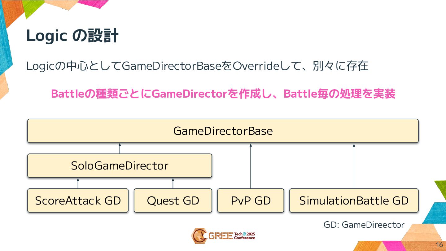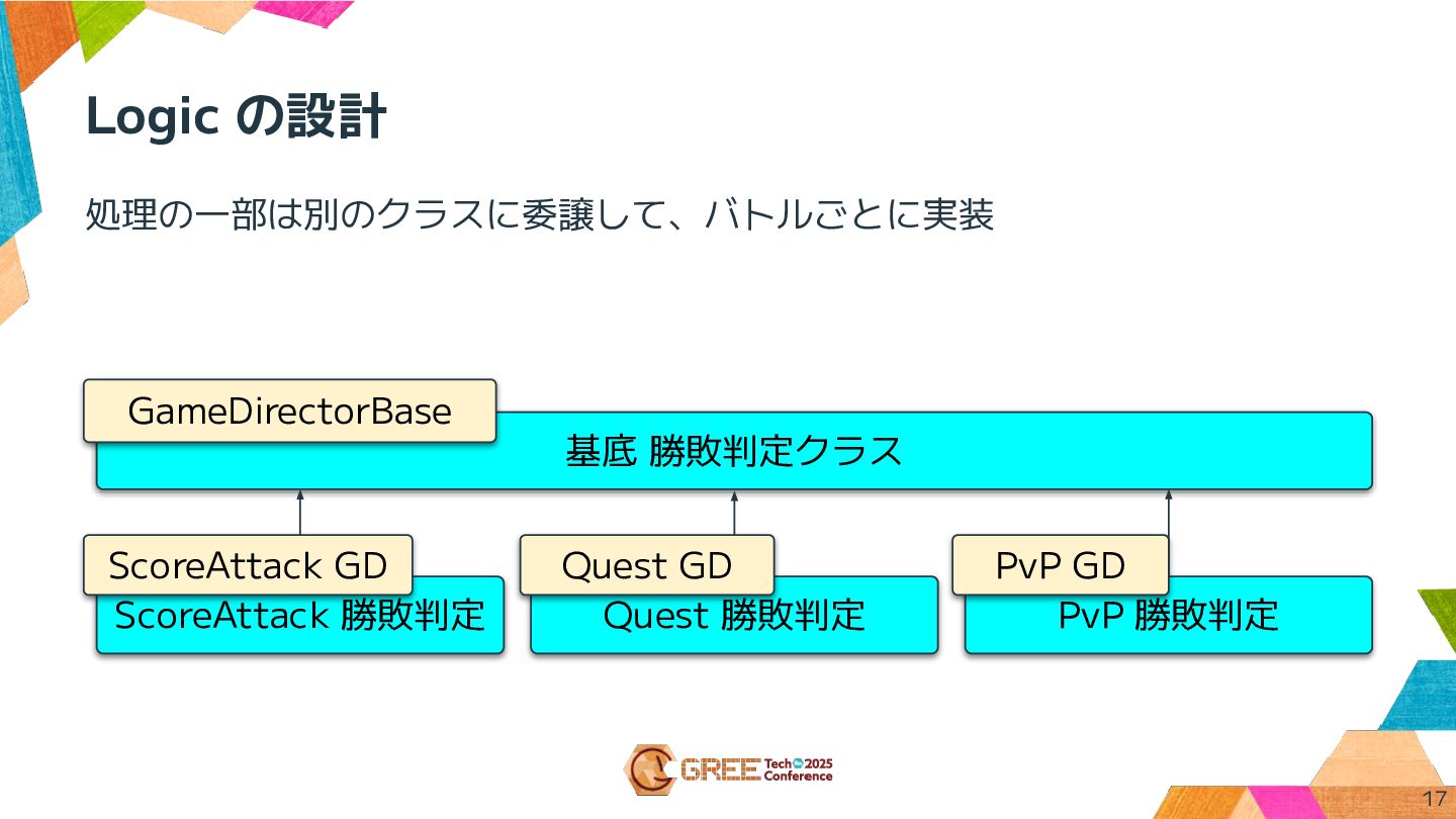 Logicの中心としてGameDirectorBaseをOverrideして、別々に存在 Logic の設計 16 GameDirectorBase SoloGameDirector ScoreAttack GD Quest GD