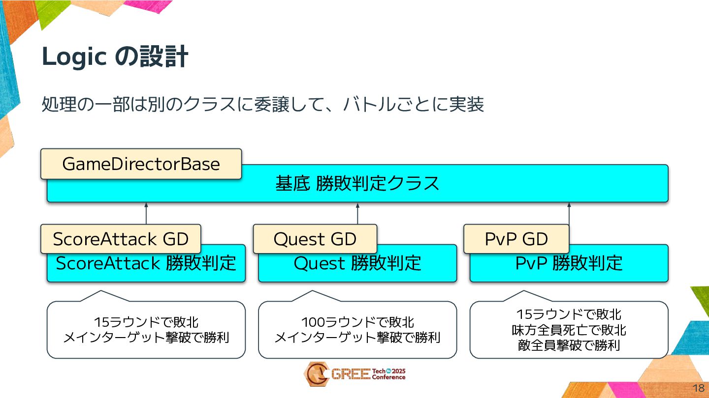 Logic の設計 17 処理の一部は別のクラスに委譲して、バトルごとに実装 基底 勝敗判定クラス ScoreAttack 勝敗判定 Quest 勝敗判定
