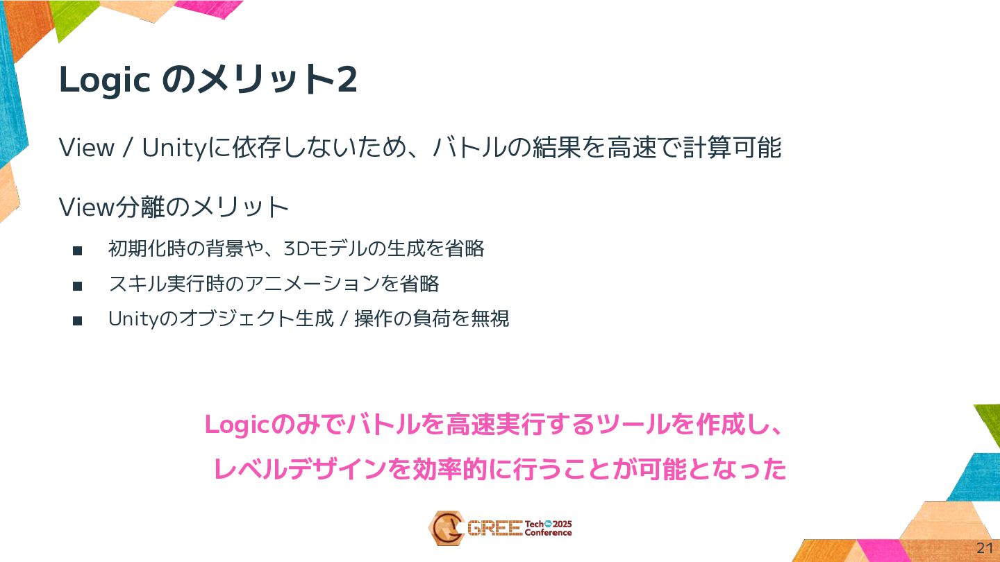 / 操作の負荷を無視 Logic のメリット2 21 Logicのみでバトルを高速実行するツールを作成し、 レベルデザインを効率的に行うことが可能となった