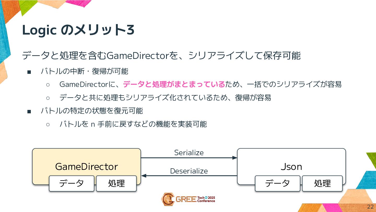 バトルを n 手前に戻すなどの機能を実装可能 Logic のメリット3 22 GameDirector Json Serialize Deserialize データ 処理 データ 処理