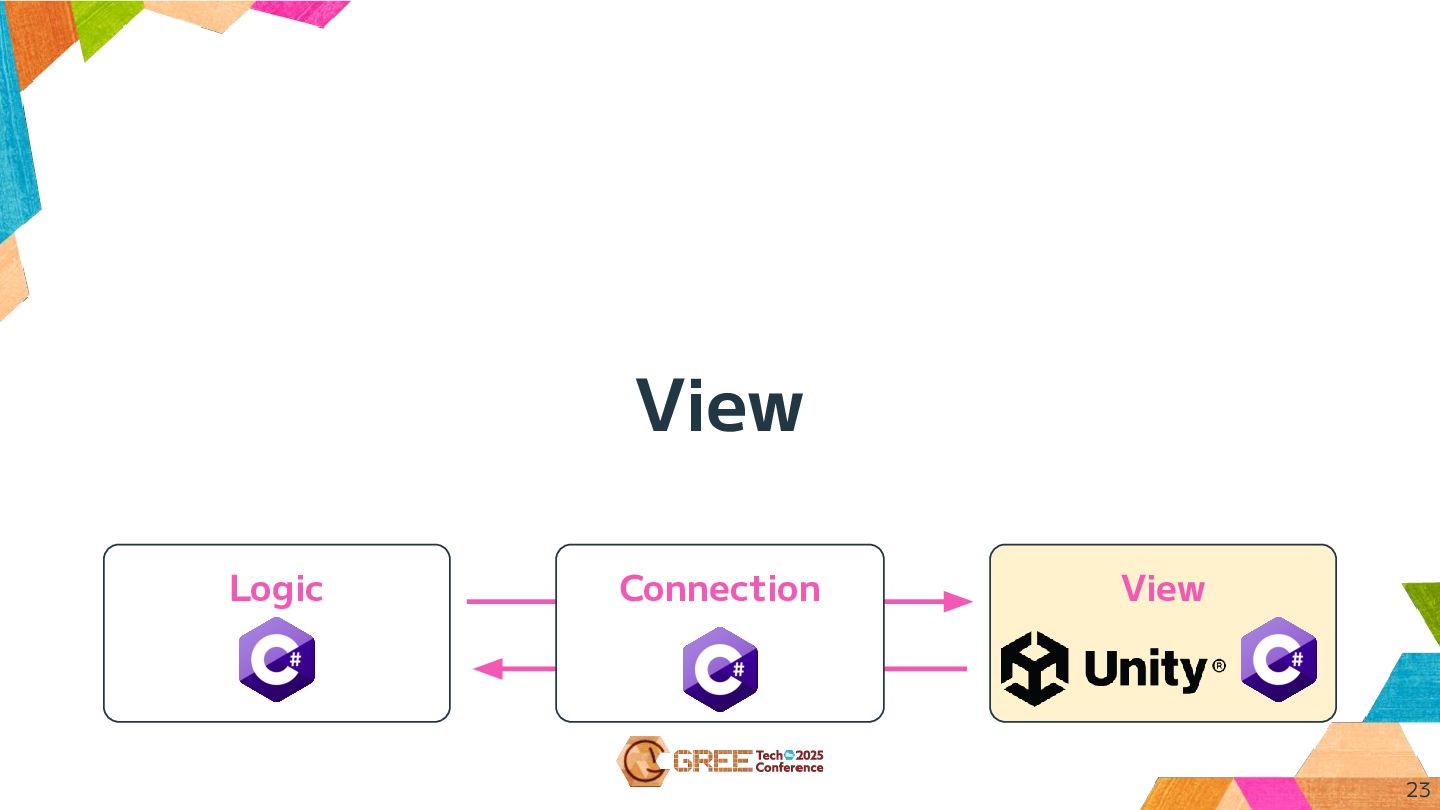 Command と Connection を通して、Logic は View を参照せずに 情報を送信可能 同じく、View も