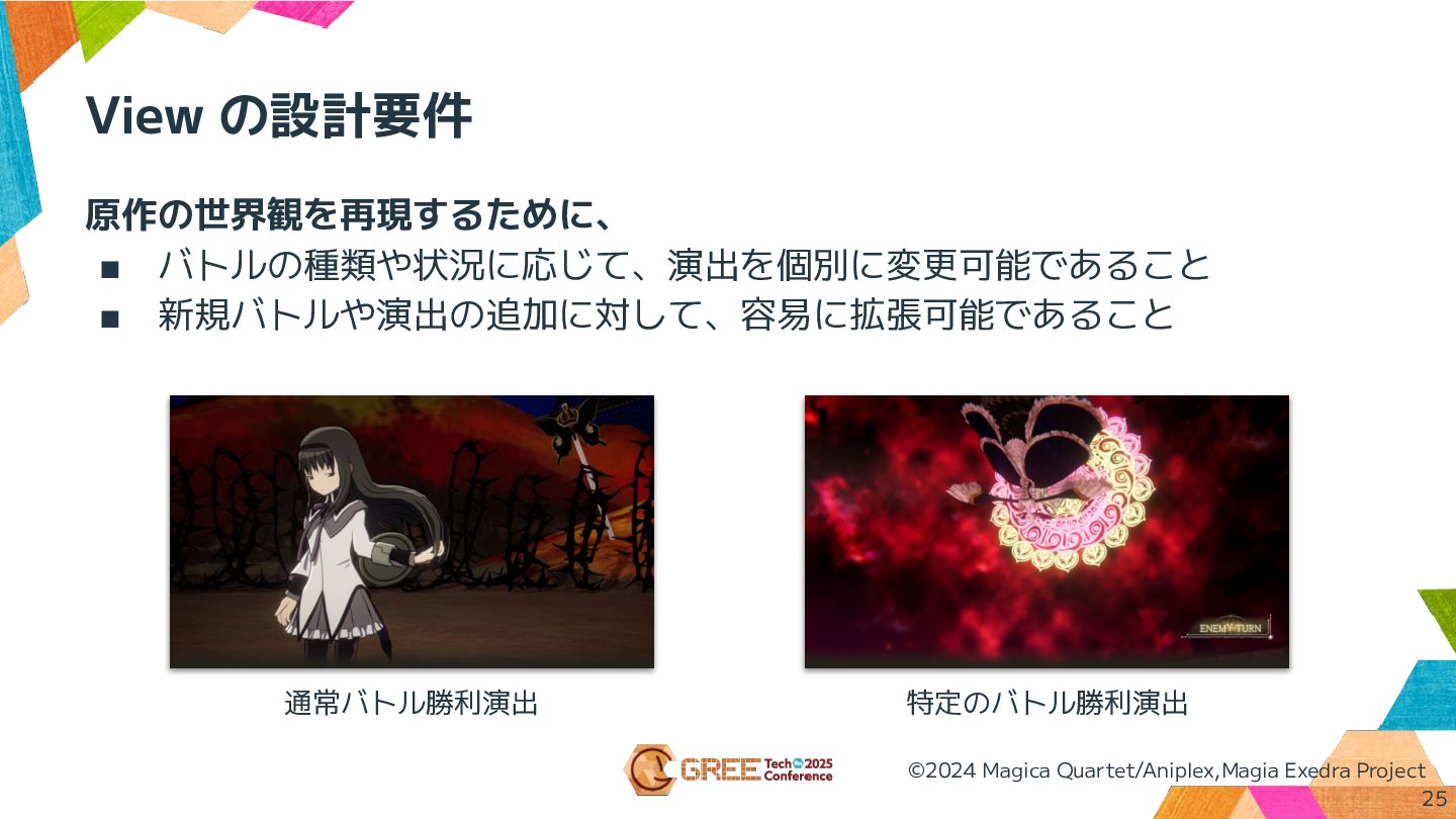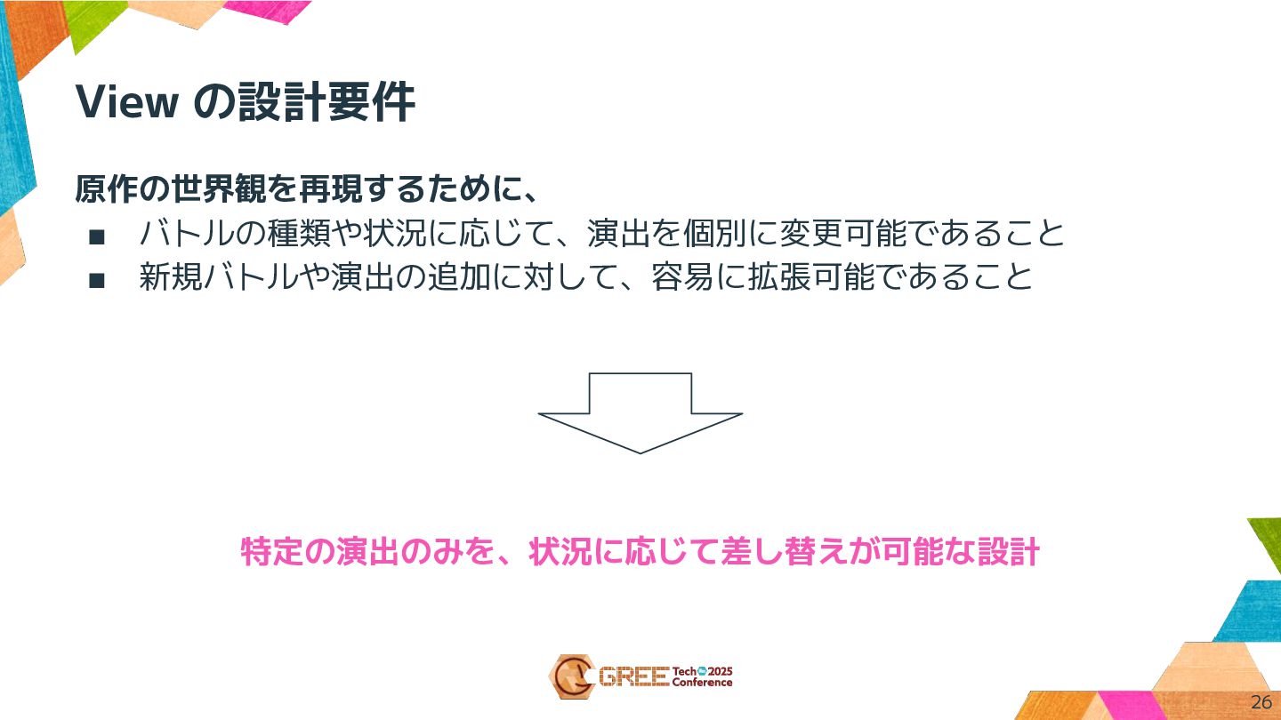 原作の世界観を再現するために、 ▪ バトルの種類や状況に応じて、演出を個別に変更可能であること ▪ 新規バトルや演出の追加に対して、容易に拡張可能であること View の設計要件 25 通常バトル勝利演出 特定のバトル勝利演出