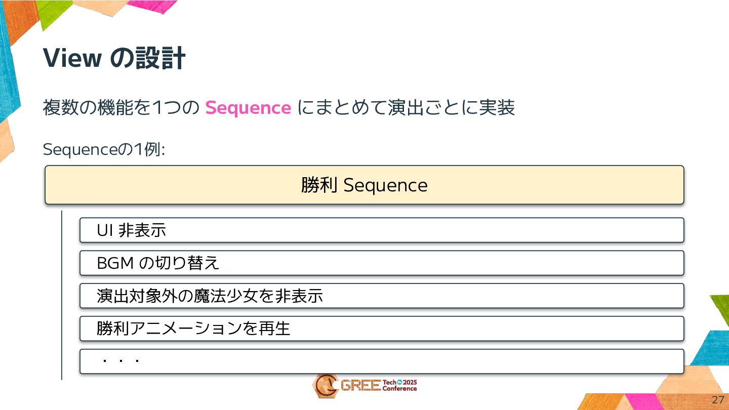 複数の機能を1つの Sequence にまとめて演出ごとに実装 View の設計 27 勝利 Sequence UI 非表示