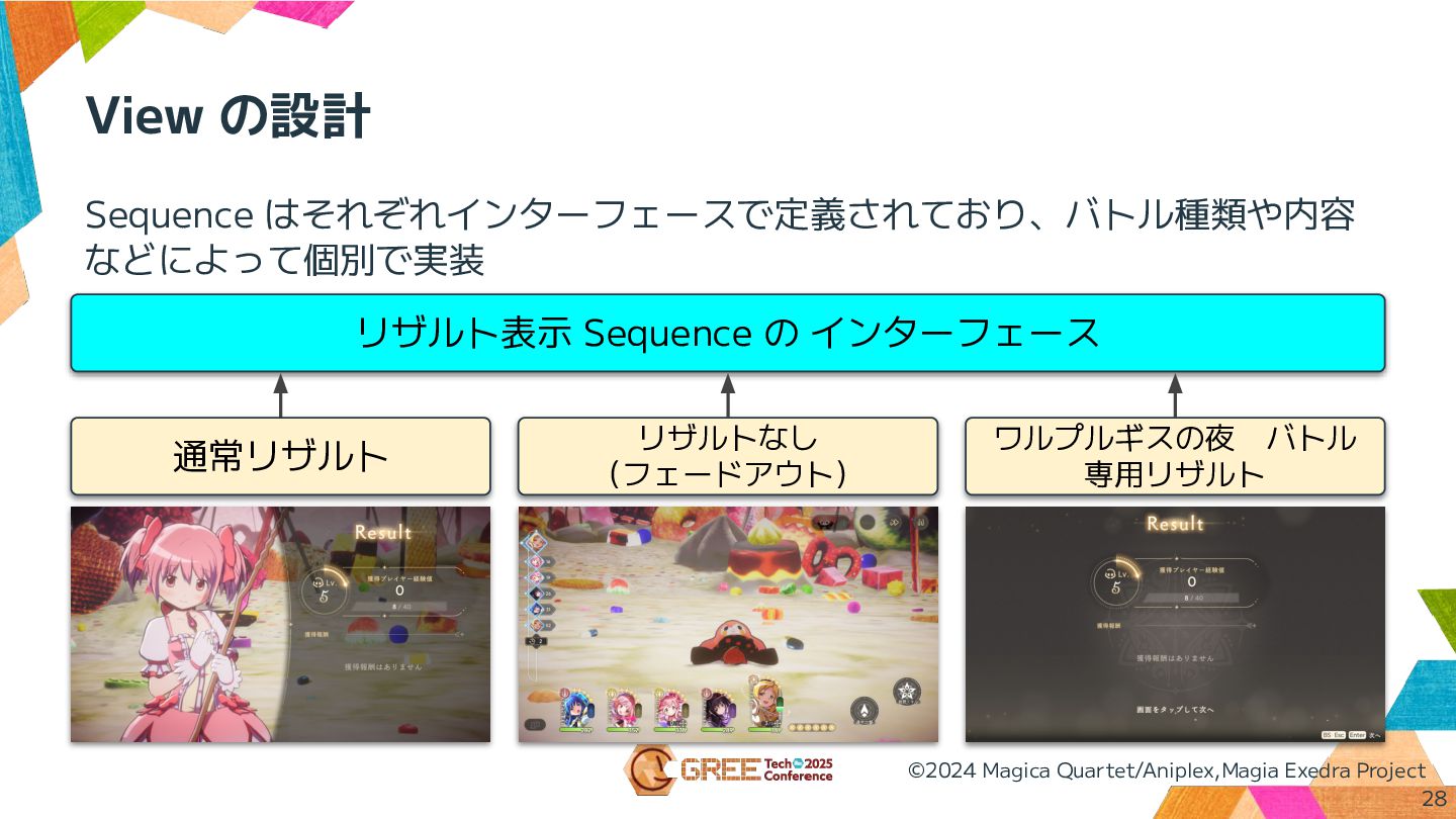 Sequence はそれぞれインターフェースで定義されており、バトル種類や内容 などによって個別で実装 View の設計 28 リザルト表示 Sequence の インターフェース