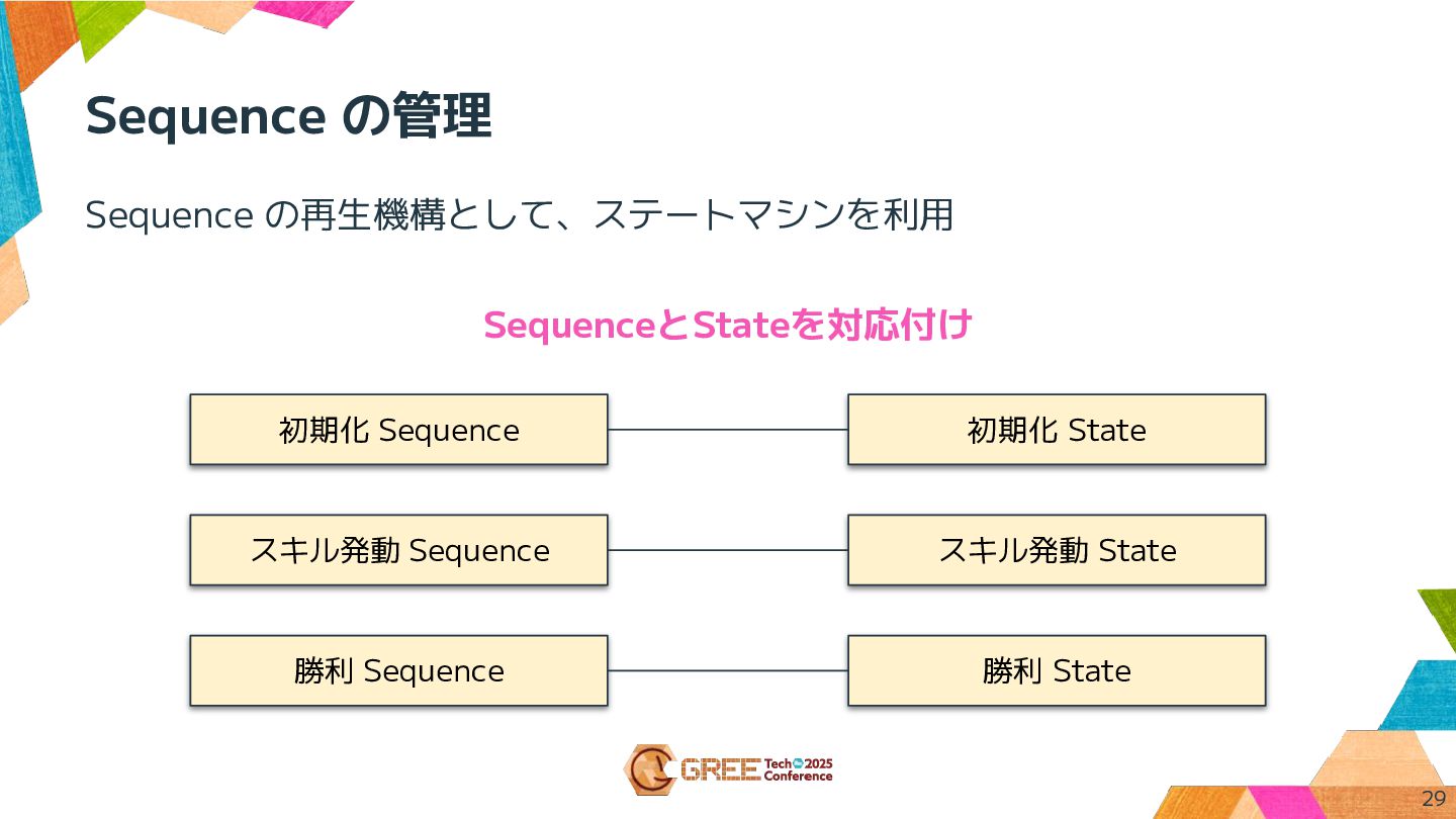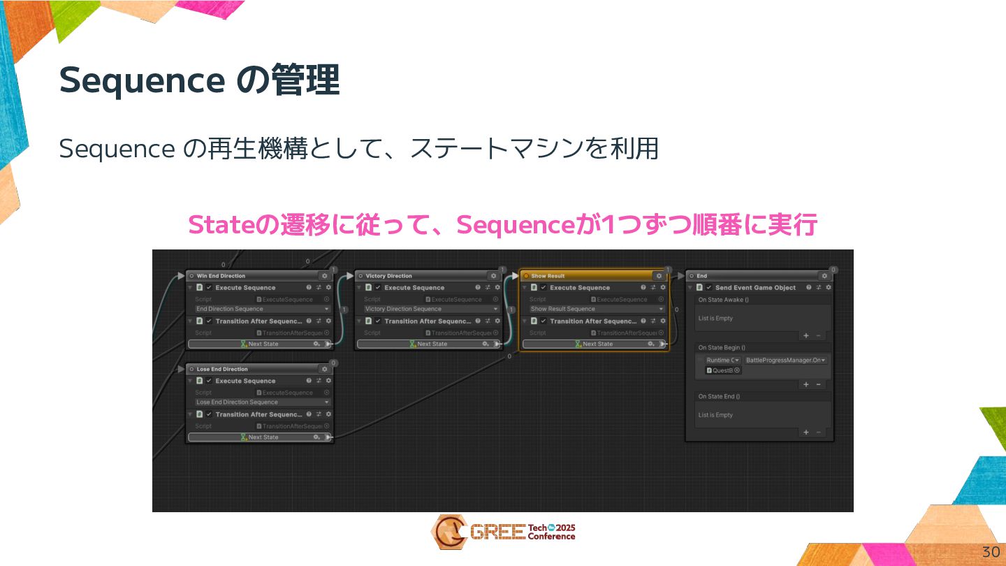 Sequence の再生機構として、ステートマシンを利用 Sequence の管理 29 勝利 Sequence 初期化 Sequence スキル発動