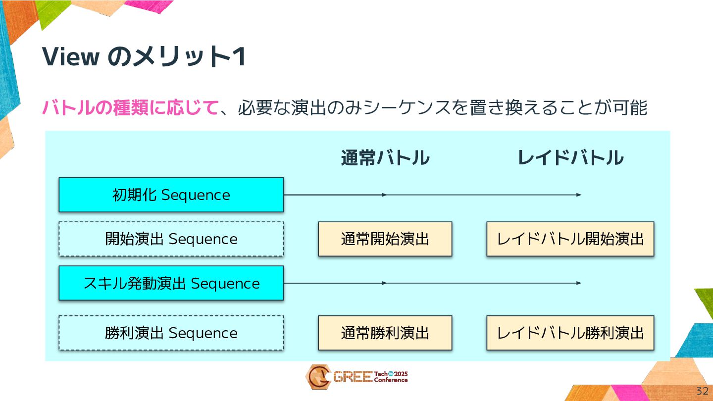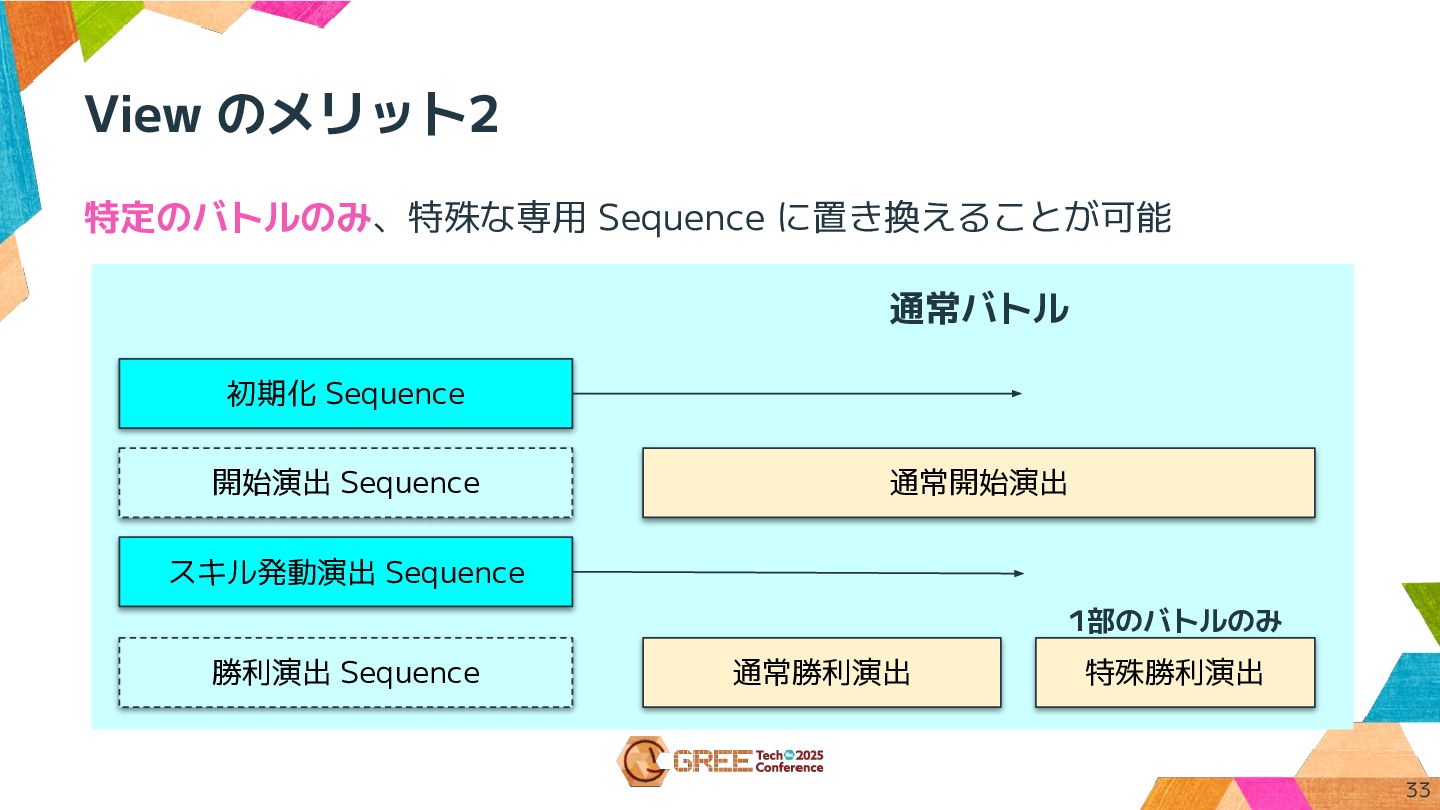 View のメリット1 バトルの種類に応じて、必要な演出のみシーケンスを置き換えることが可能 32 スキル発動演出 Sequence 初期化 Sequence 勝利演出 Sequence