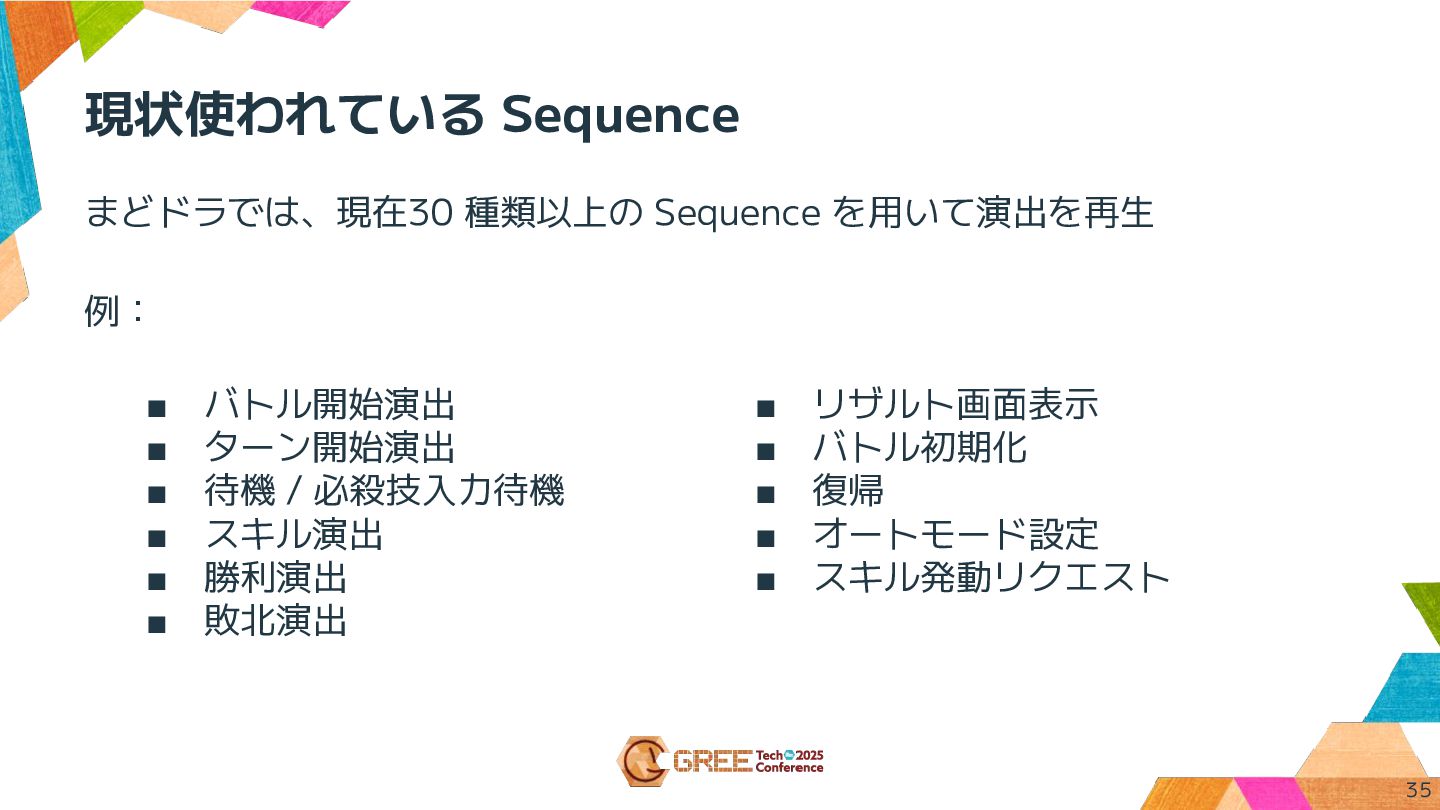 まどドラでは、現在30 種類以上の Sequence を用いて演出を再生 例: 現状使われている Sequence 35 ▪ バトル開始演出