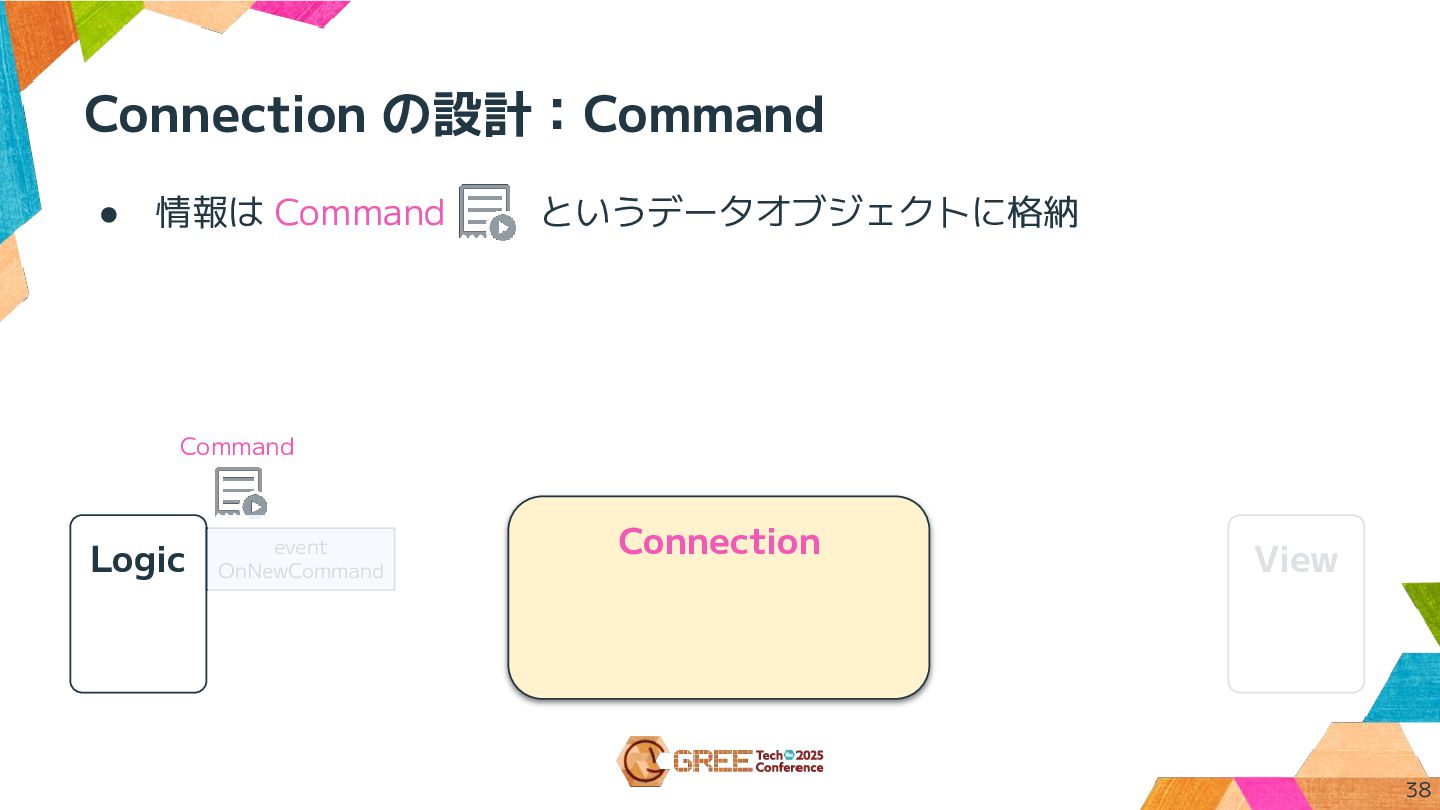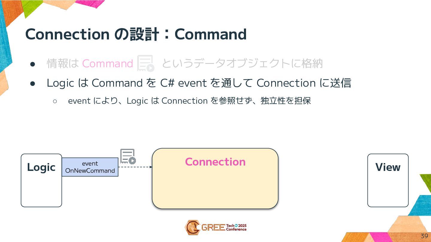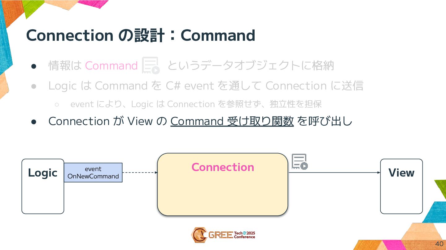 event を通して Connection に送信 ◦ event により、Logic は Connection を参照せず、独立性を担保 Connection の設計:Command 39 Logic View Connection event OnNewCommand