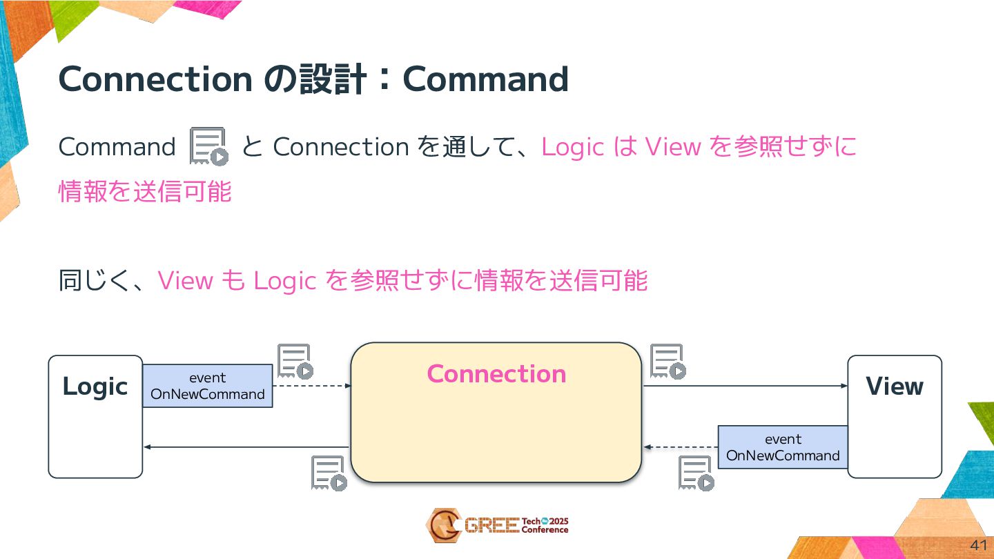 event を通して Connection に送信 ◦ event により、Logic は Connection を参照せず、独立性を担保 • Connection が View の Command 受け取り関数 を呼び出し Connection の設計:Command 40 Logic View Connection event OnNewCommand