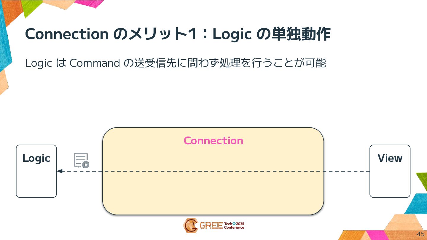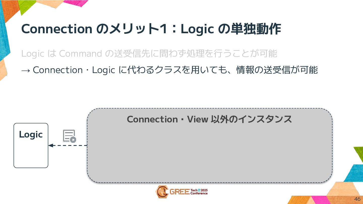 Logic は Command の送受信先に問わず処理を行うことが可能 → Connection・Logic に代わるクラスを用いても、情報の送受信が可能 Connection のメリット1:Logic の単独動作