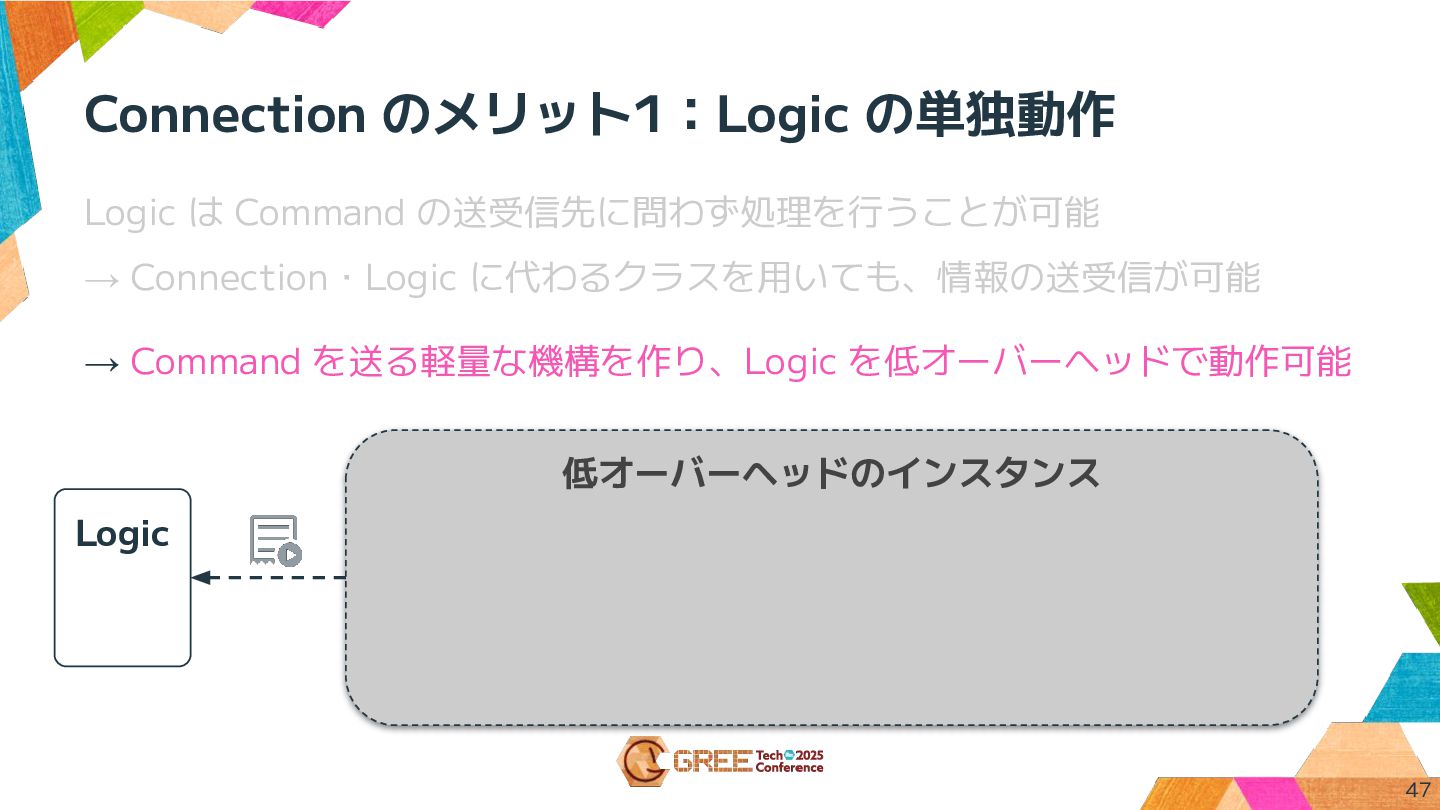 Logic は Command の送受信先に問わず処理を行うことが可能 → Connection・Logic に代わるクラスを用いても、情報の送受信が可能 → Command を送る軽量な機構を作り、Logic