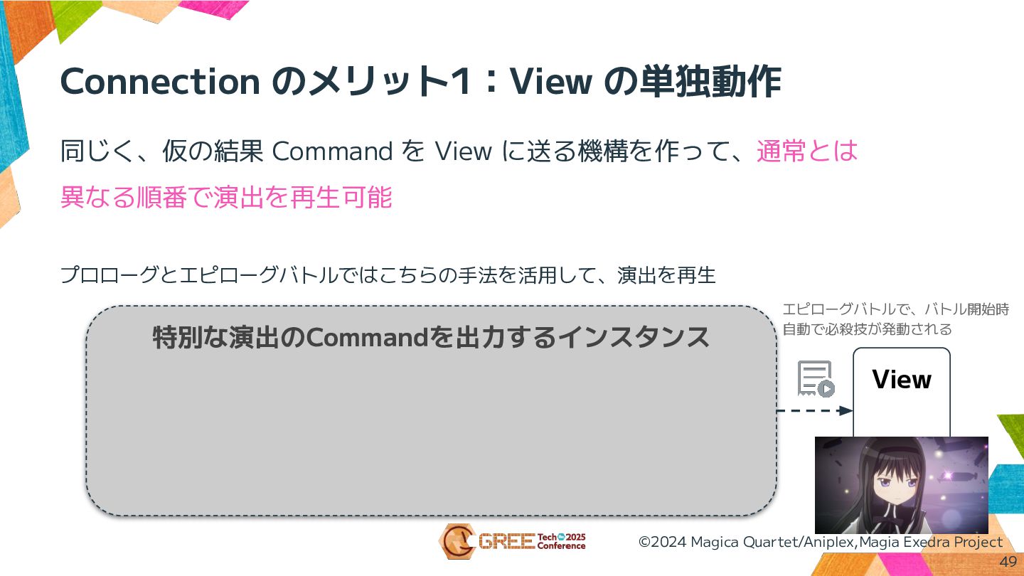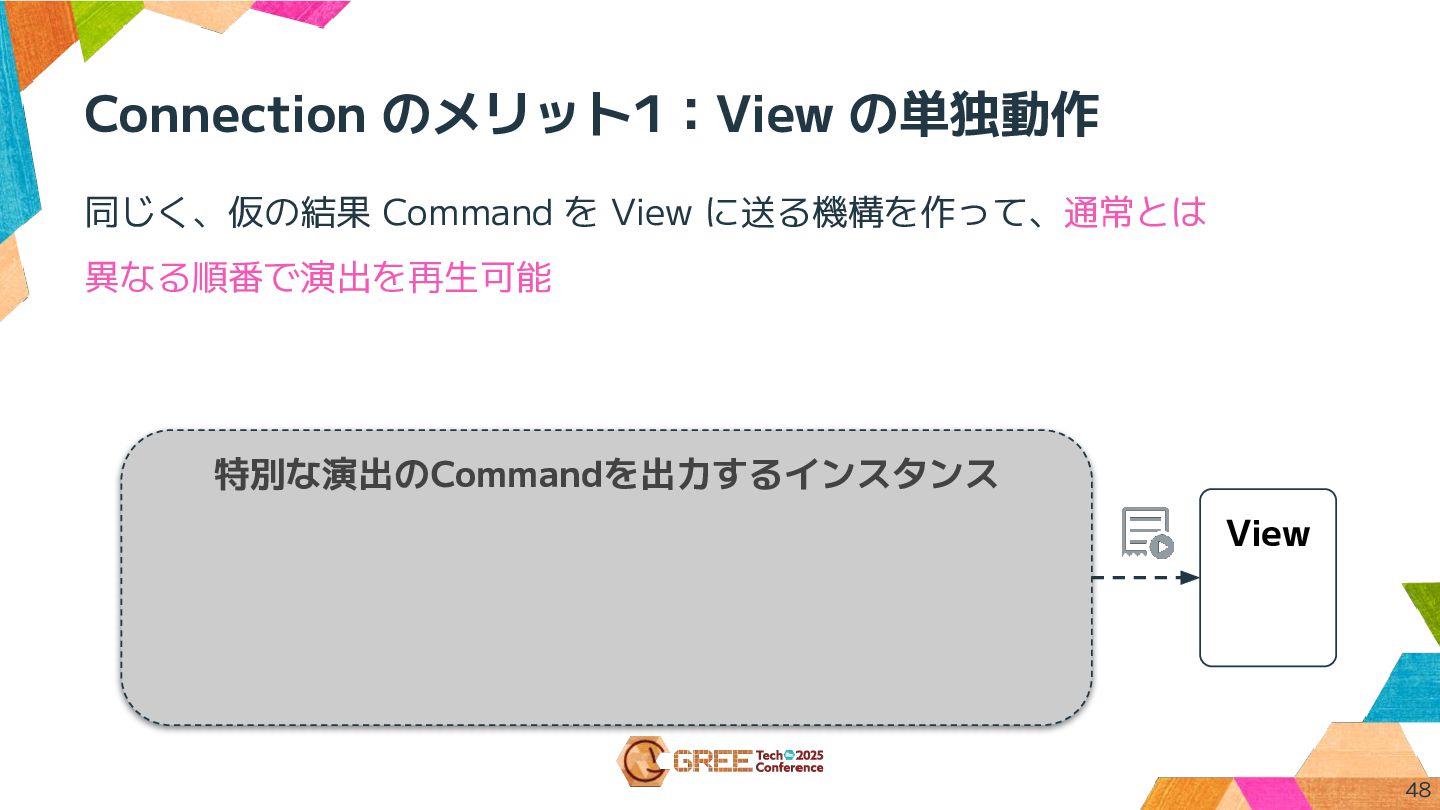同じく、仮の結果 Command を View に送る機構を作って、通常とは 異なる順番で演出を再生可能 Connection のメリット1:View の単独動作 48