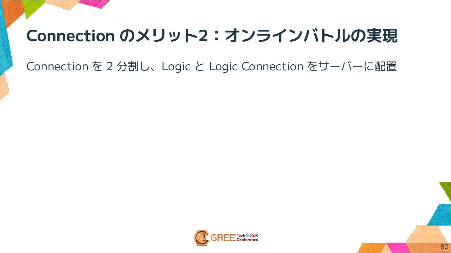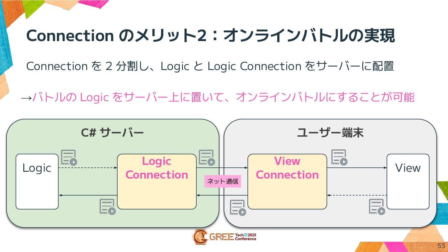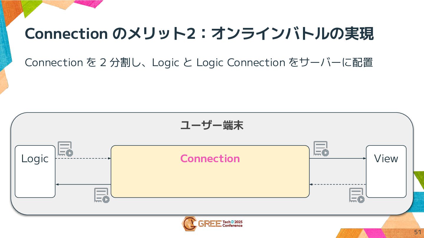 Connection を 2 分割し、Logic と Logic Connection をサーバーに配置 Connection のメリット2:オンラインバトルの実現