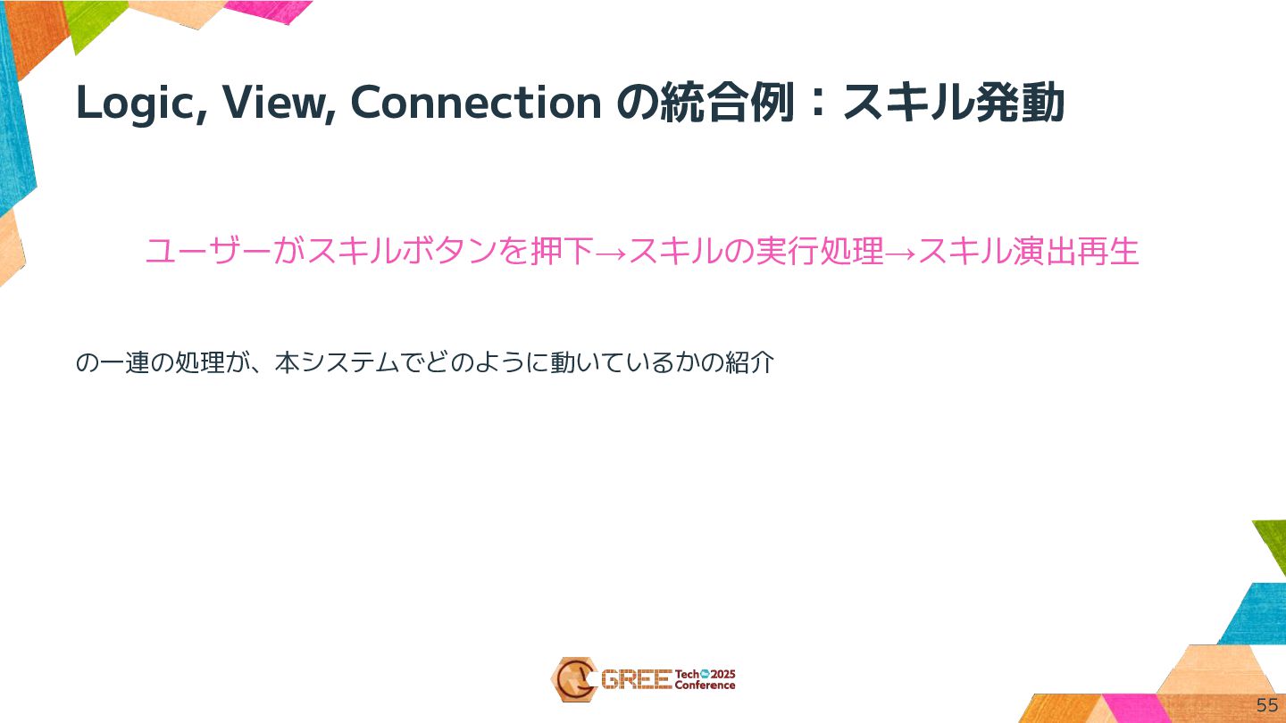 Logic, View, Connection の統合例:スキル発動 ユーザーがスキルボタンを押下→スキルの実行処理→スキル演出再生 の一連の処理が、本システムでどのように動いているかの紹介 55