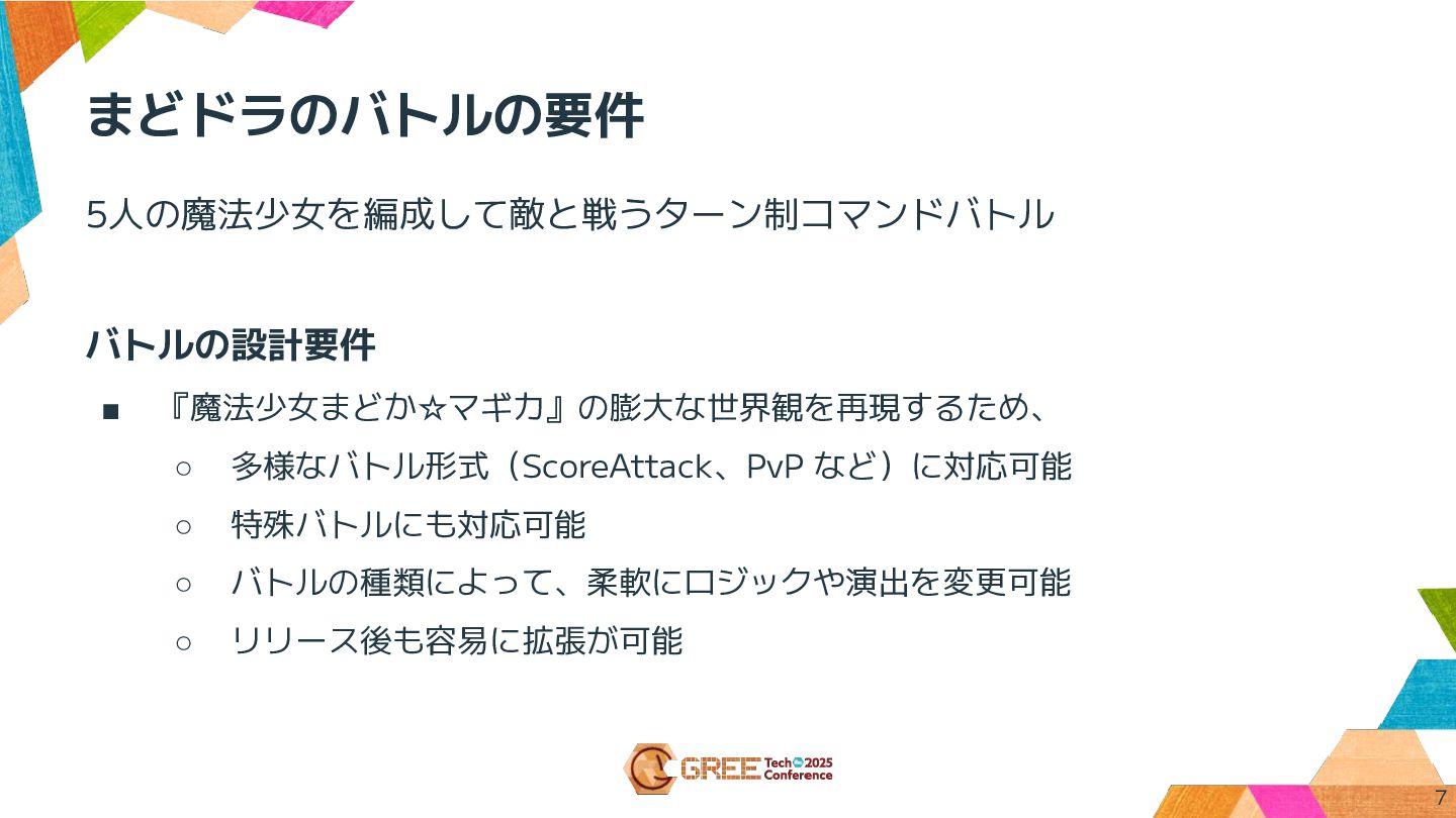 バトルの種類によって、柔軟にロジックや演出を変更可能 ◦ リリース後も容易に拡張が可能 まどドラのバトルの要件 7