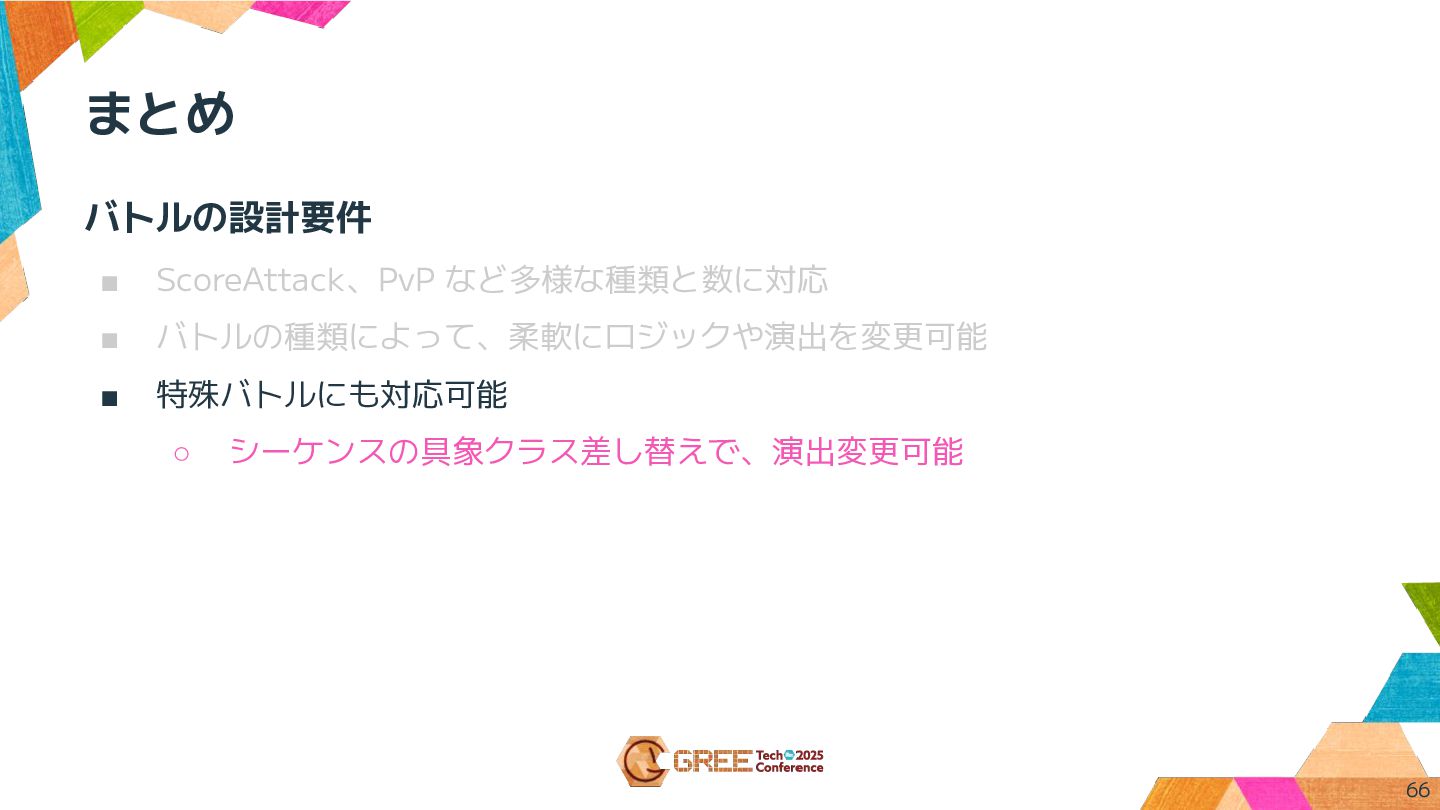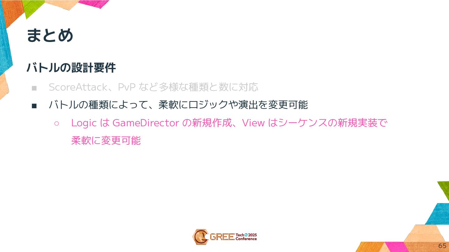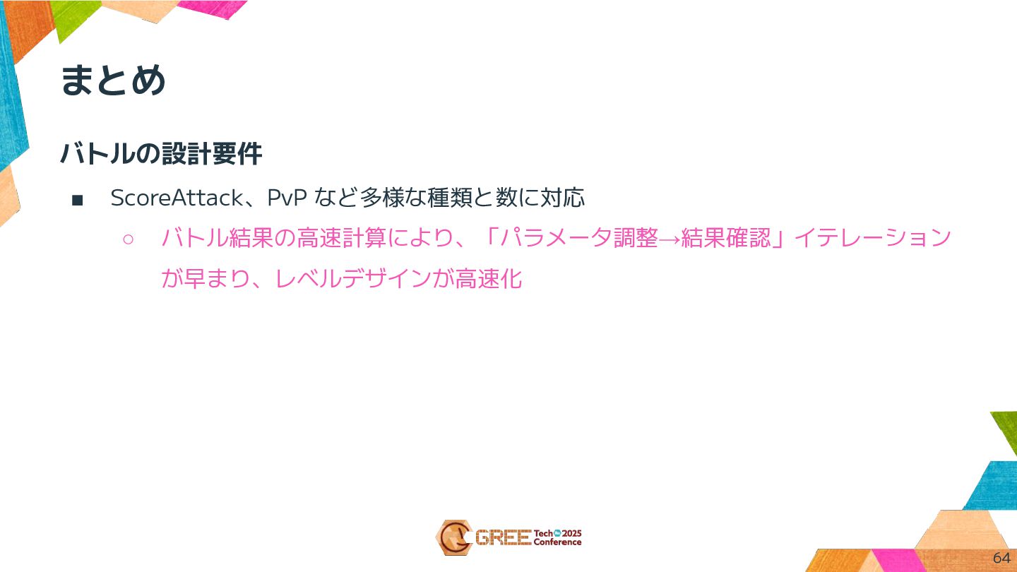 バトルの設計要件 ▪ ScoreAttack、PvP など多様な種類と数に対応 ◦ バトル結果の高速計算により、「パラメータ調整→結果確認」イテレーション が早まり、レベルデザインが高速化 まとめ 64