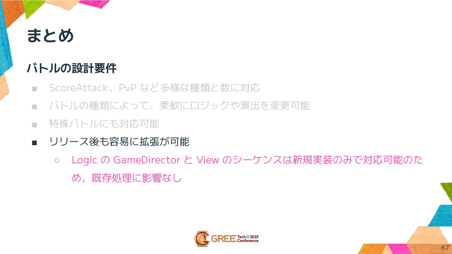 ◦ Logic の GameDirector と View のシーケンスは新規実装のみで対応可能のた め、既存処理に影響なし まとめ 67