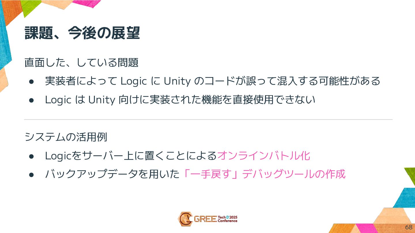 は Unity 向けに実装された機能を直接使用できない システムの活用例 • Logicをサーバー上に置くことによるオンラインバトル化 • バックアップデータを用いた「一手戻す」デバッグツールの作成 68