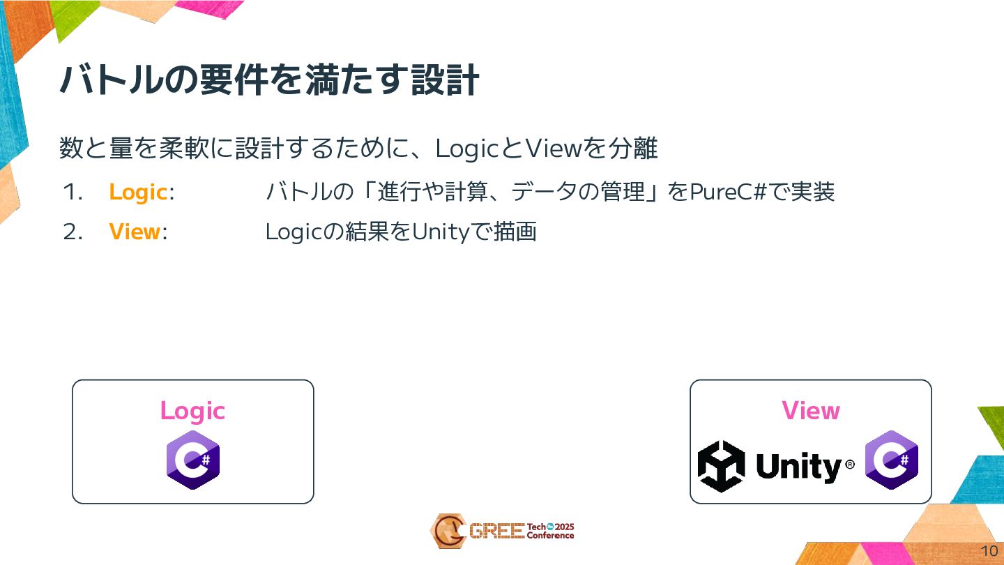 バトルの要件を満たす設計 数と量を柔軟に設計するために、LogicとViewを分離 1. Logic: バトルの「進行や計算、データの管理」をPureC#で実装 9 Logic