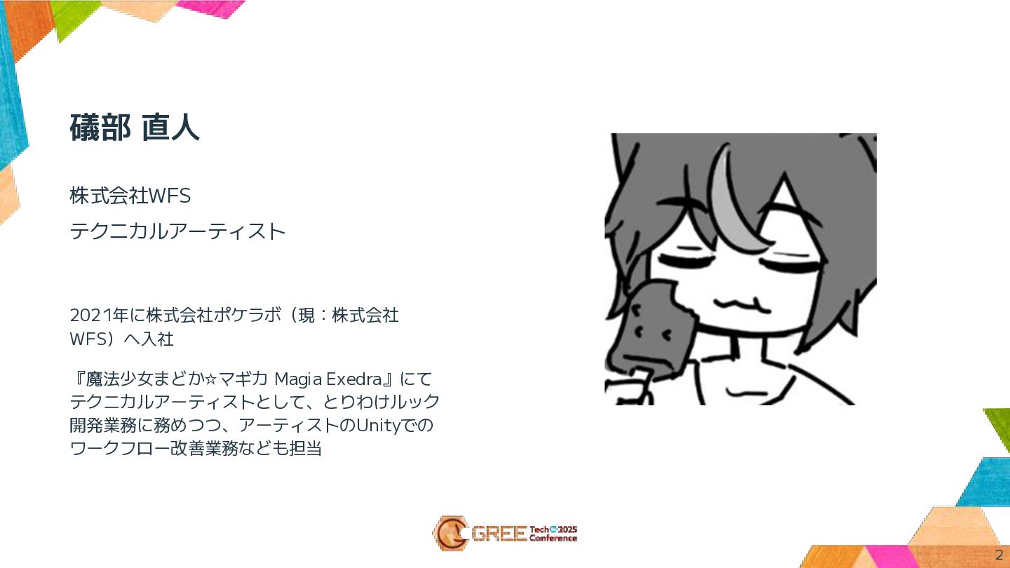 礒部 直人 2021年に株式会社ポケラボ(現:株式会社 WFS)へ入社 『魔法少女まどか☆マギカ Magia Exedra』にて テクニカルアーティストとして、とりわけルック 開発業務に務めつつ、アーティストのUnityでの ワークフロー改善業務なども担当
