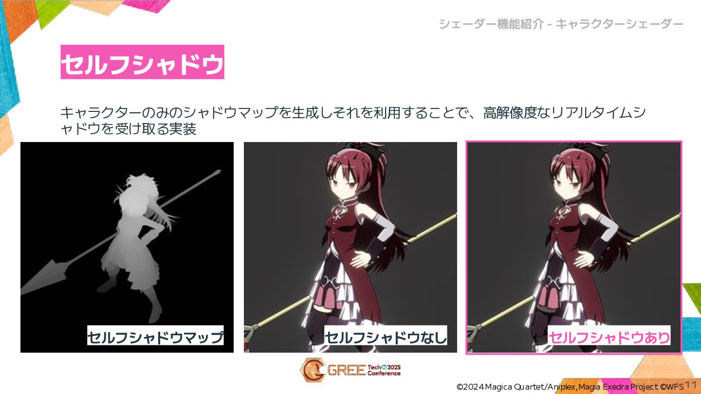 キャラクターのみのシャドウマップを生成しそれを利用することで、高解像度なリアルタイムシ ャドウを受け取る実装 セルフシャドウ 11 シェーダー機能紹介 - キャラクターシェーダー ©2024 Magica Quartet/Aniplex,Magia