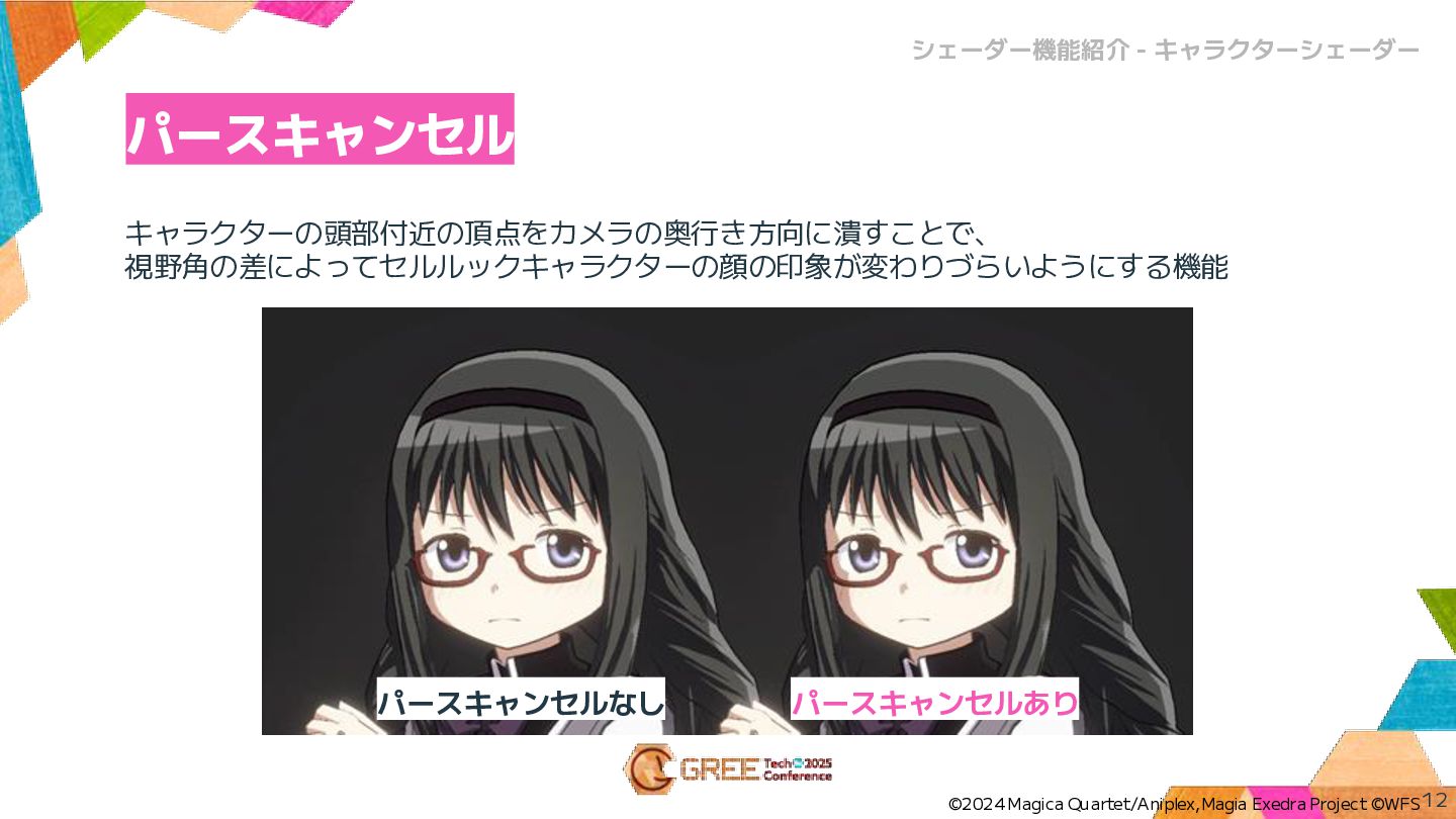 キャラクターの頭部付近の頂点をカメラの奥行き方向に潰すことで、 視野角の差によってセルルックキャラクターの顔の印象が変わりづらいようにする機能 パースキャンセル 12 シェーダー機能紹介 - キャラクターシェーダー ©2024 Magica Quartet/Aniplex,Magia