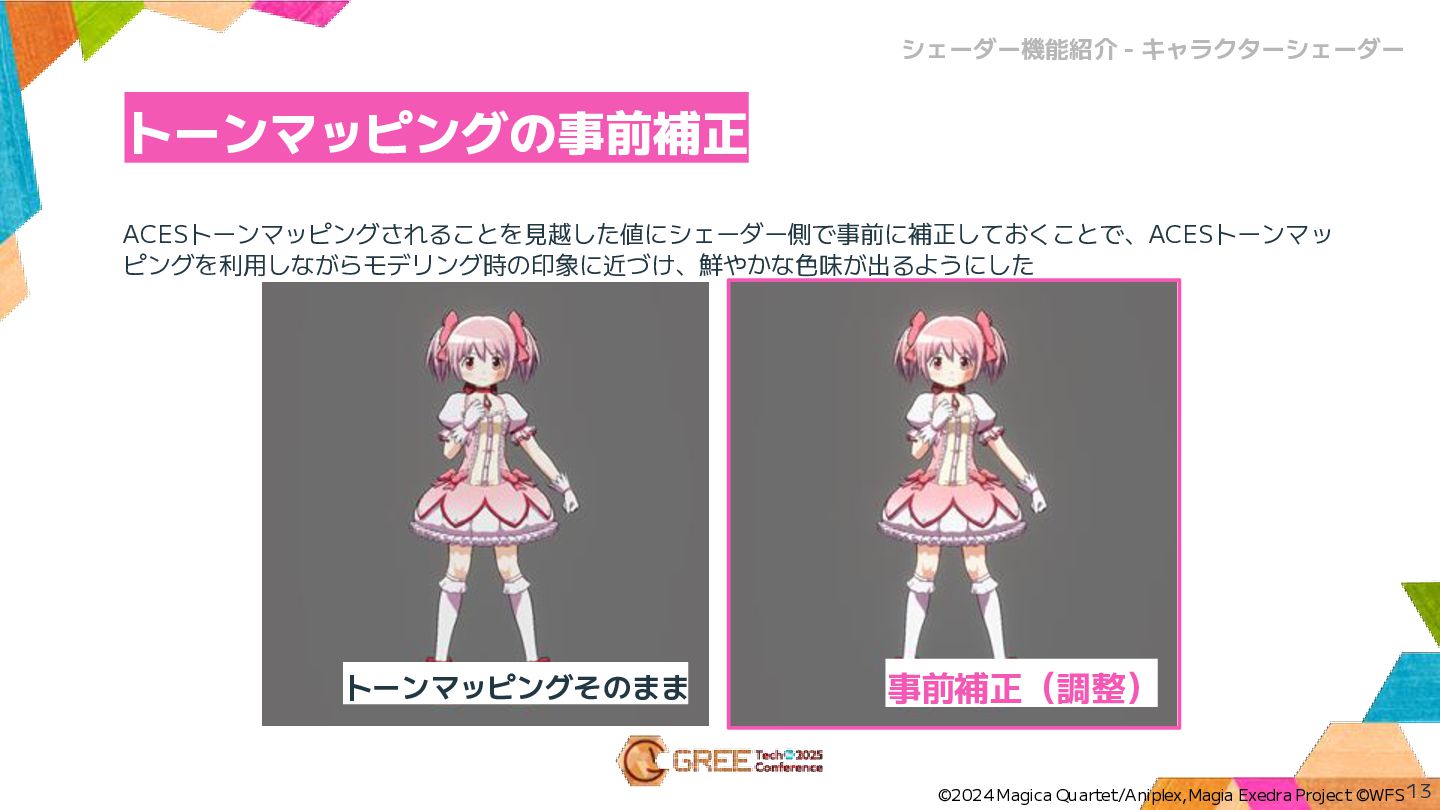 ACESトーンマッピングされることを見越した値にシェーダー側で事前に補正しておくことで、ACESトーンマッ ピングを利用しながらモデリング時の印象に近づけ、鮮やかな色味が出るようにした トーンマッピングの事前補正 13 シェーダー機能紹介 - キャラクターシェーダー ©2024 Magica Quartet/Aniplex,Magia