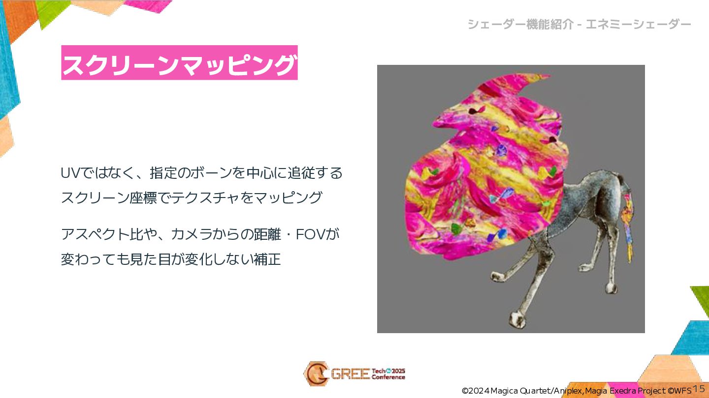 スクリーンマッピング UVではなく、指定のボーンを中心に追従する スクリーン座標でテクスチャをマッピング アスペクト比や、カメラからの距離・FOVが 変わっても見た目が変化しない補正 15 シェーダー機能紹介 - エネミーシェーダー ©2024