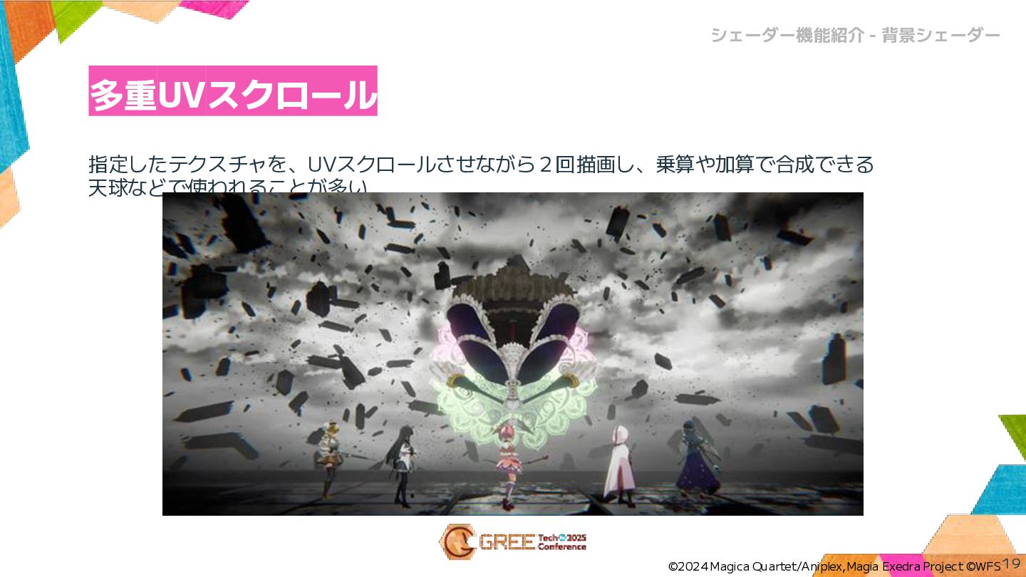 指定したテクスチャを、UVスクロールさせながら2回描画し、乗算や加算で合成できる 天球などで使われることが多い 多重UVスクロール 19 シェーダー機能紹介 - 背景シェーダー ©2024 Magica Quartet/Aniplex,Magia
