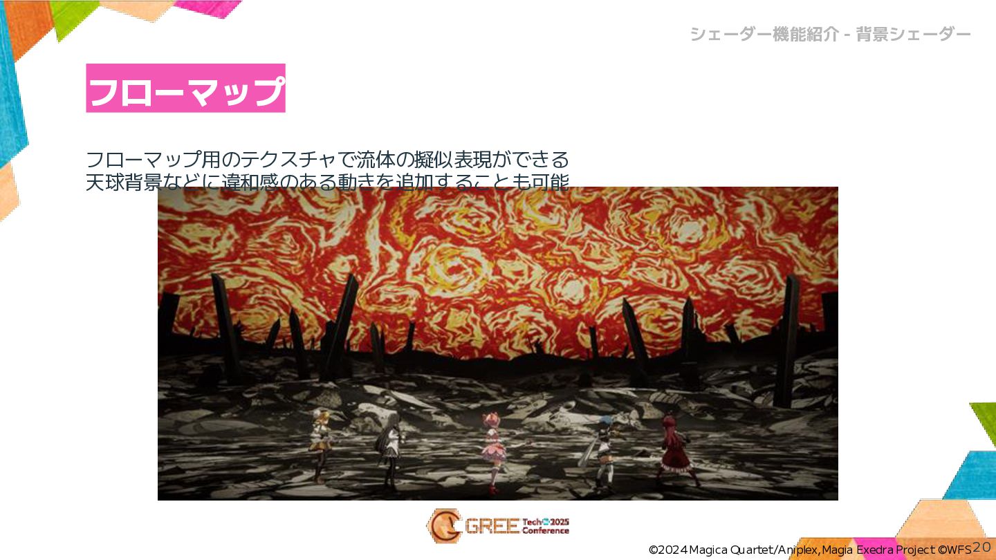 フローマップ用のテクスチャで流体の擬似表現ができる 天球背景などに違和感のある動きを追加することも可能 フローマップ 20 シェーダー機能紹介 - 背景シェーダー ©2024 Magica Quartet/Aniplex,Magia