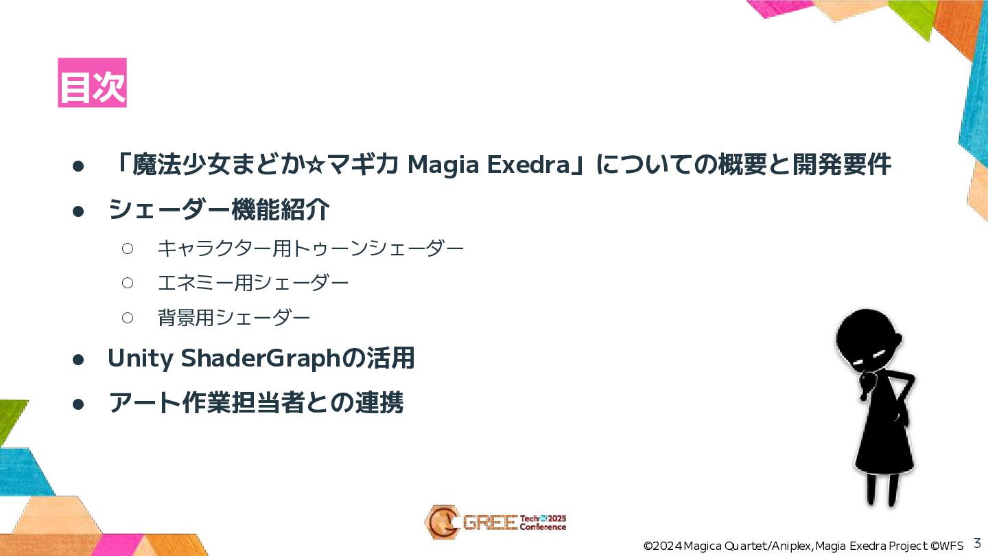 目次 • 「魔法少女まどか☆マギカ Magia Exedra」についての概要と開発要件 • シェーダー機能紹介 ◦ キャラクター用トゥーンシェーダー ◦