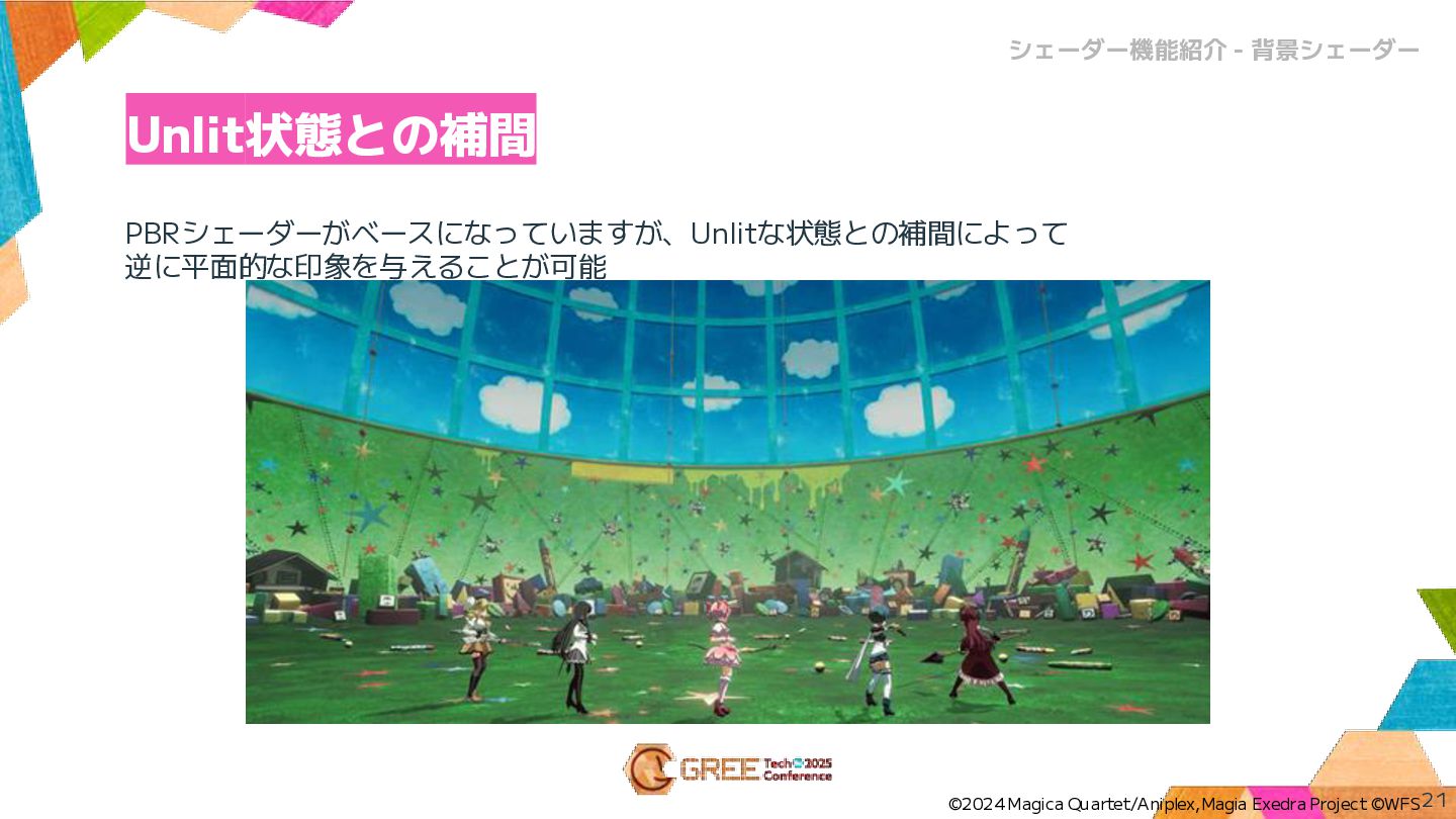 PBRシェーダーがベースになっていますが、Unlitな状態との補間によって 逆に平面的な印象を与えることが可能 Unlit状態との補間 21 シェーダー機能紹介 - 背景シェーダー ©2024 Magica Quartet/Aniplex,Magia