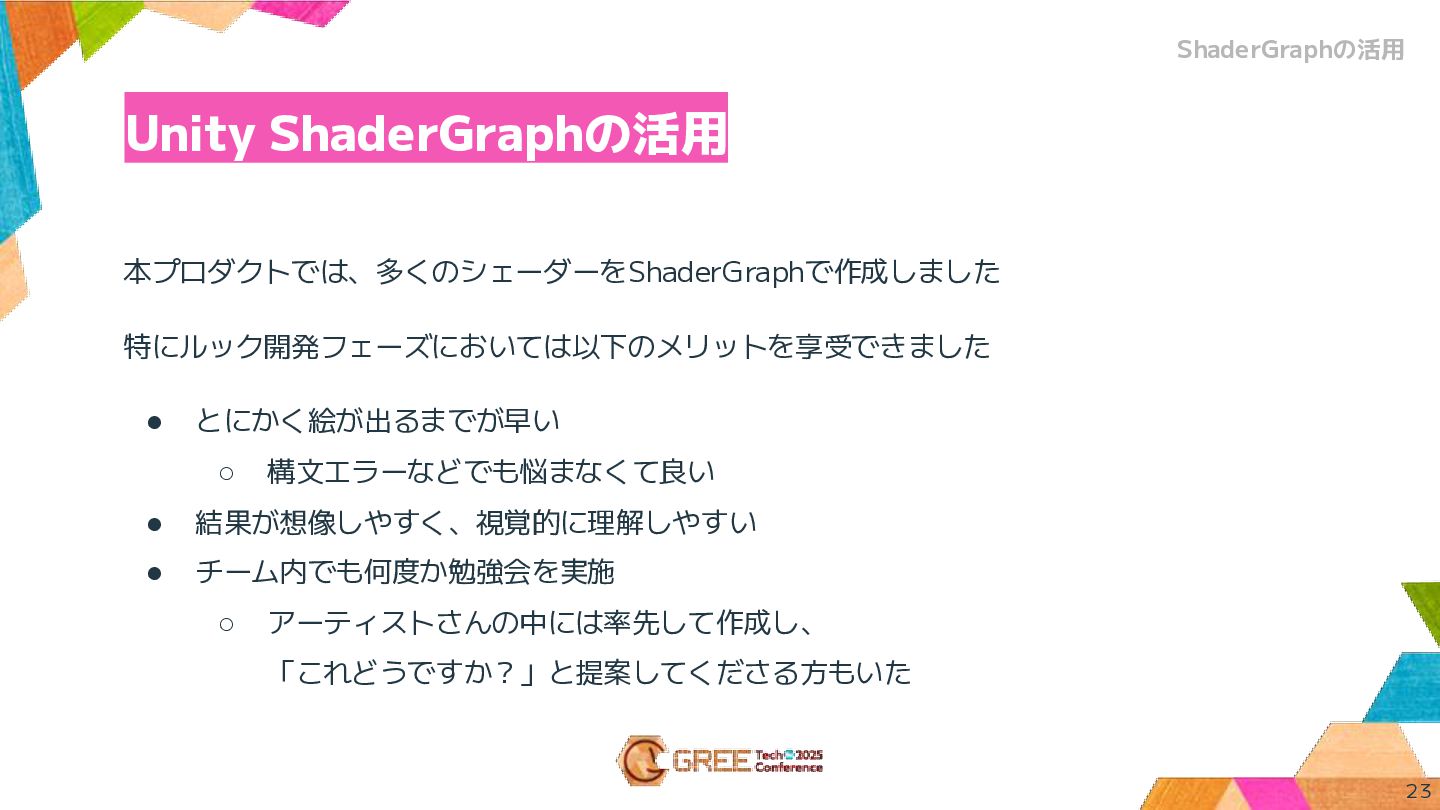 Unity ShaderGraphの活用 23 ShaderGraphの活用 本プロダクトでは、多くのシェーダーをShaderGraphで作成しました 特にルック開発フェーズにおいては以下のメリットを享受できました • とにかく絵が出るまでが早い ◦ 構文エラーなどでも悩まなくて良い