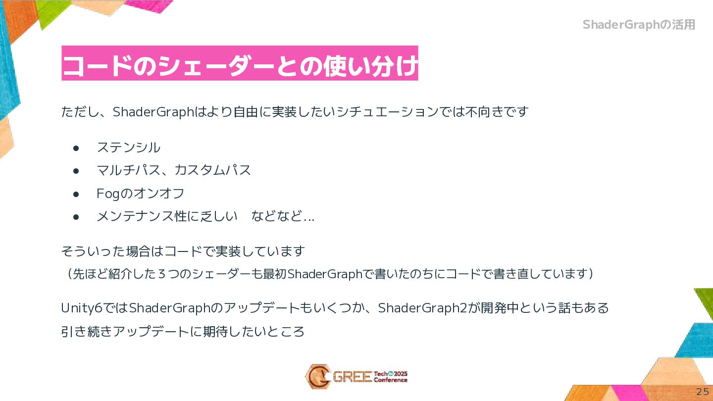 ただし、ShaderGraphはより自由に実装したいシチュエーションでは不向きです • ステンシル • マルチパス、カスタムパス • Fogのオンオフ • メンテナンス性に乏しい などなど...
