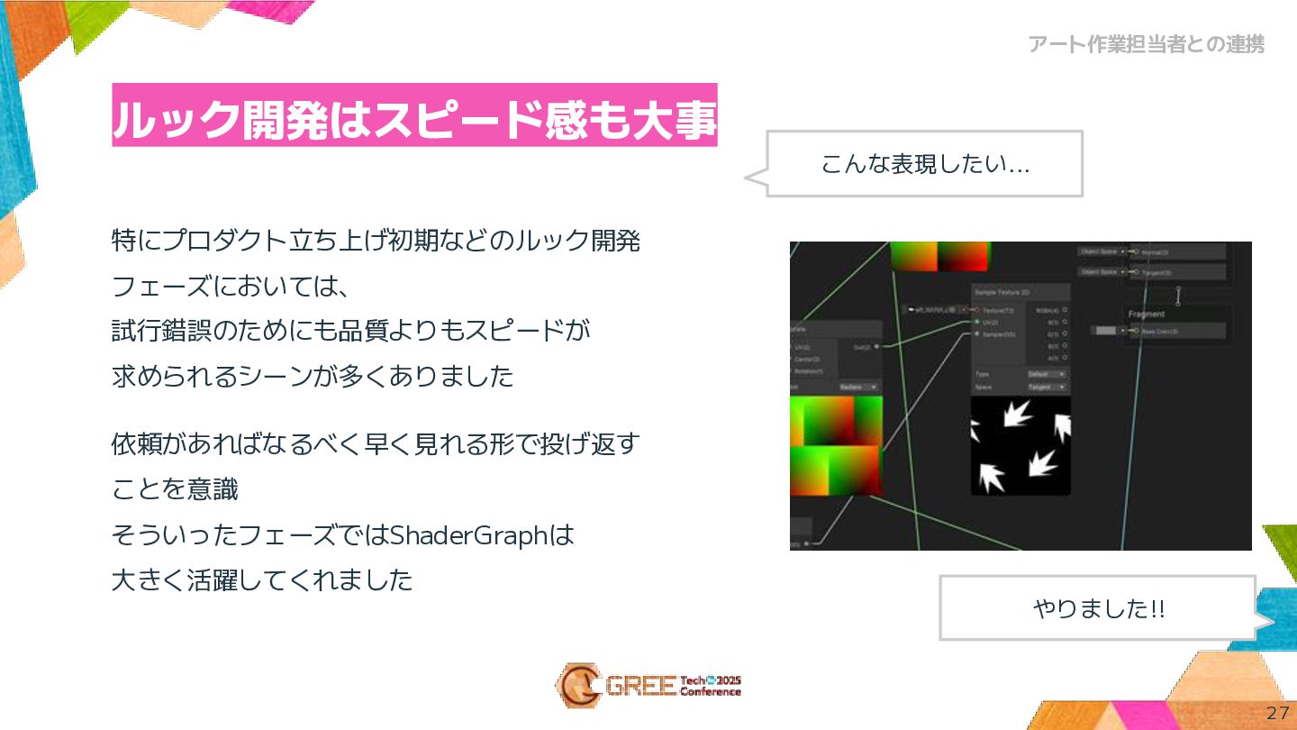 、セルフシャドウ など、原作アニメの表現を 3Dに落とし込むための様々な工夫 • ShaderGraphによる開発速度とチーム連携の向上 ◦ 開発初期フェーズではShaderGraphを積極的に活用し、視覚的で迅速な試行錯誤を実践 ◦ より複雑な機能はコードで実装し、適材適所で使い分けることが重要 • アーティストとの円滑なコミュニケーションとワークフロー改善 ◦ ルック開発のスピード感を保つため、依頼には素早く対応し、まず形にして見せることが重要 ◦ Unityや作業環境の改善にも取り組んだ