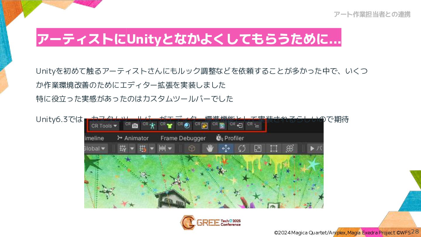 アーティストにUnityとなかよくしてもらうために... 28 ©2024 Magica Quartet/Aniplex,Magia Exedra Project ©WFS アート作業担当者との連携 Unityを初めて触るアーティストさんにもルック調整などを依頼することが多かった中で、いくつ