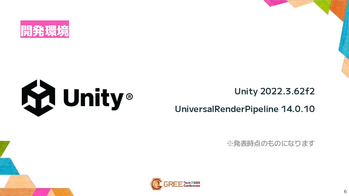 6 開発環境 Unity 2022.3.62f2 UniversalRenderPipeline 14.0.10 ※発表時点のものになります