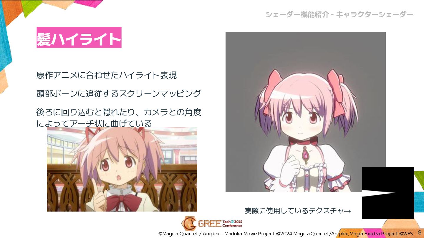 髪ハイライト 原作アニメに合わせたハイライト表現 頭部ボーンに追従するスクリーンマッピング 後ろに回り込むと隠れたり、カメラとの角度 によってアーチ状に曲げている 8 シェーダー機能紹介 - キャラクターシェーダー ©Magica